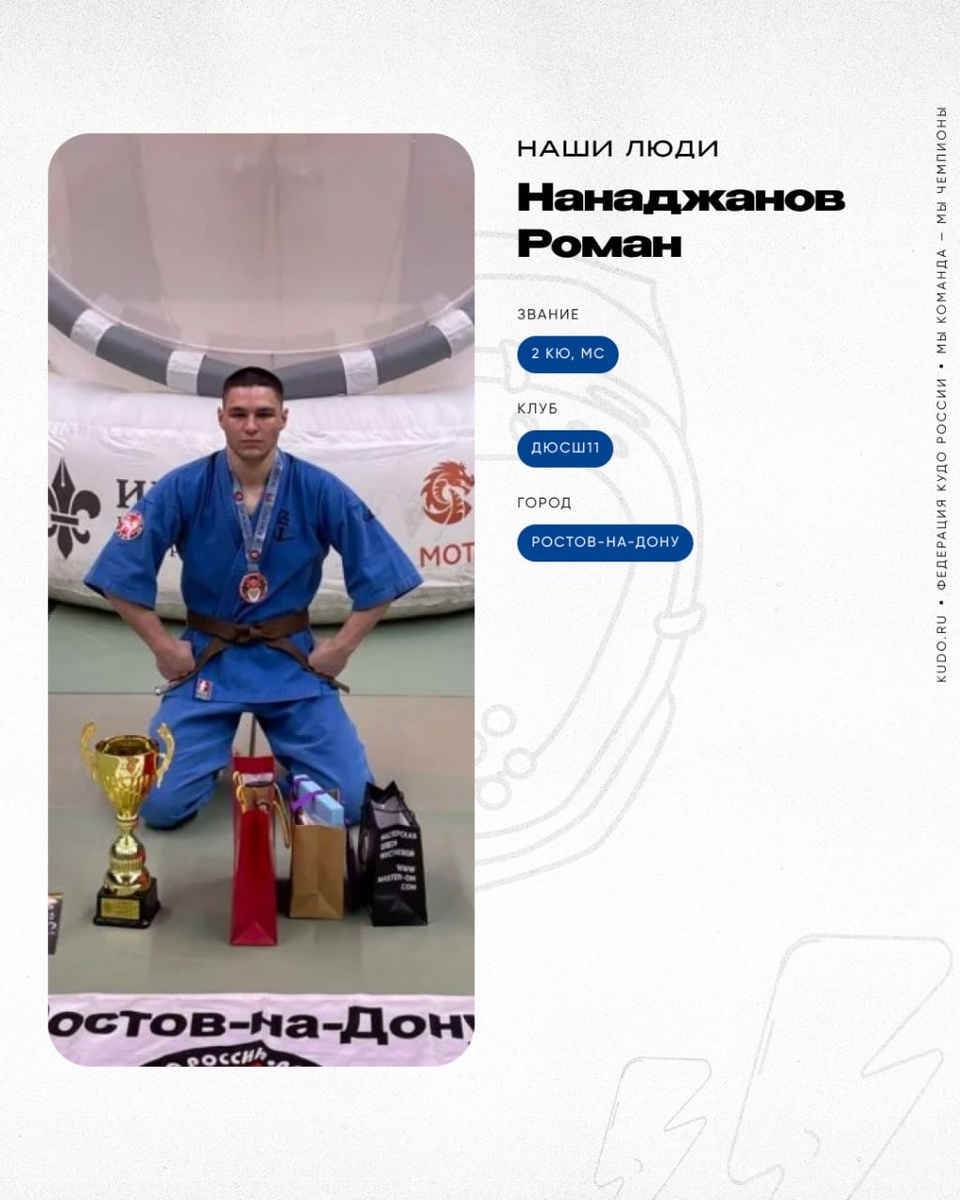 #НашиЛюди ⠀ 🥋 Нанаджанов Роман — 2 кю, МС ⠀ Мастер спорта, серебряный призёр чемпионата России, трудолюбивый спортсмен и будущий профессиональный тренер. Ценит кудо за универсальность и духовную составляющую. Мечтает о международных победах. ⠀ ⛩ Спортивный клуб — ДЮСШ11 📍 Город проживания — Ростов-на-Дону ⠀ Роман Нанаджанов посвятил кудо больше половины своей жизни. 13 лет назад родители привели маленького Рому в секцию боевых искусств и не прогадали. ⠀ «Кудо зацепило меня своей универсальностью и духовной составляющей», — вспоминает он. ⠀ 👉🏻 Читайте продолжение интервью на нашем сайте — https://kudo.ru/people/nanadzhanov-roman/