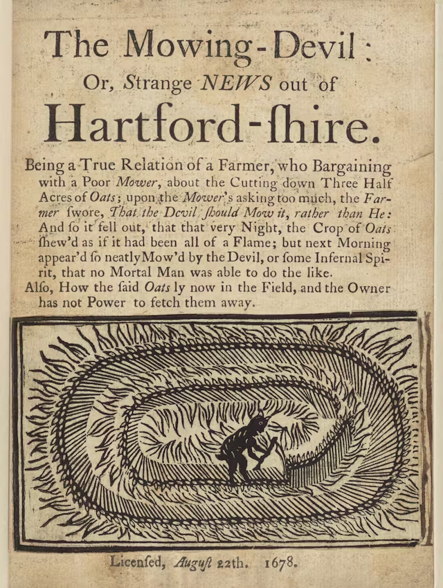 Цереологи, преданные своему делу исследователи кругов на полях, обратились к архивам, чтобы отыскать хоть какие-то исторические записи. В 1989 году редакторы британского журнала о паранормальных явлениях Fortean Times обнаружили брошюру, которая, по-видимому, является старейшим известным изображением кругов на полях. Датированная 22 августа 1678 года, книга «Косящий дьявол: Или странные новости из Хартфордшира» открывается озорной гравюрой на дереве. Маленькая пухлая фигурка дьявола наклонилась, держа в руке косу. Он бредёт по полю спелого овса, пробираясь внутрь концентрическими кругами, оставляя за собой след из срубленных стеблей. Его рот открыт, словно для того, чтобы перевести дух, пока он работает, а его маленький козий хвостик виляет.