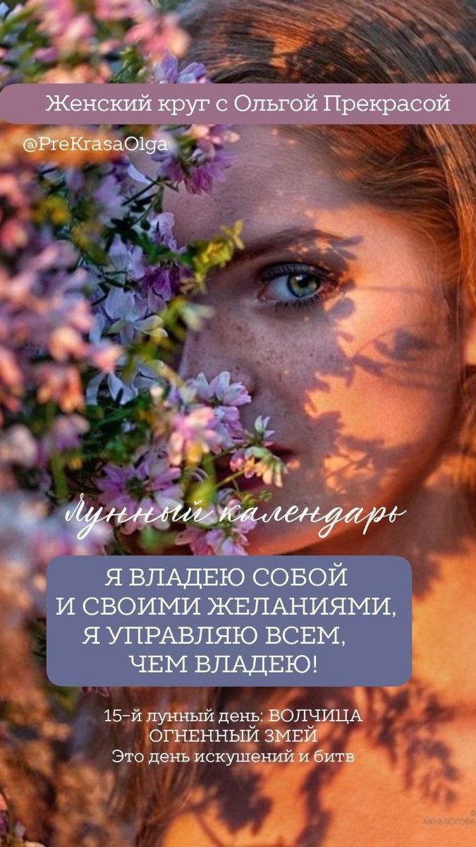 ТАНЦУЮ, ПОЮ, ЖИВУ В ПОТОКЕ ЖИЗНИ В дни рядом с полнолунием - женские силы находятся на пике. И для достижения задуманного хорошо сохранять стрелу своего внимания и направлять в нужное русло. Сейчас пик. Это время праздника, танца, песни творчества. Затем, с убывающей луной приходит время для отдыха, интеграции, подведения итогов. Я ВЛАДЕЮ СОБОЙ И СВОИМИ ЖЕЛАНИЯМИ, Я УПРАВЛЯЮ ВСЕМ, ЧЕМ ВЛАДЕЮ! ●15-й лунный день: ВОЛЧИЦА. ОГНЕННЫЙ ЗМЕЙ Это день искушений и битв. ❤️ПОЛНОЕ ОПИСАНИЕ ЗДЕСЬ ❤️ практика 15 дня ❤️ танец медитация 15 дня Я — ЖЕНЩИНА И ТВОРЮ ЭТОТ МИР ГАРМОНИЧНЫМ И ПРЕКРАСНЫМ! ●16-й лунный день БАБОЧКА Это день поддержания равновесия и состояния гармонии. ❤️ПОЛНОЕ ОПИСАНИЕ ЗДЕСЬ ❤️ медитация 16 дня Я ВДОХНОВЛЯЮ И СОЗИДАЮ, Я — БОГИНЯ И СВОБОДНА ТВОРИТЬ МИР ПО-СВОЕМУ! ●17-й лунный день ШАКТИ Это день раскрытия женской силы, обретения свободы и радости. ❤️ПОЛНОЕ ОПИСАНИЕ ЗДЕСЬ ❤️ практика 17 дня Я СПОСОБНА УВИДЕТЬ И ПРИНЯТЬ СЕБЯ ИСТИННУЮ — СО ВСЕМИ МОИМИ КАЧЕСТВАМИ! ●18-й лунн