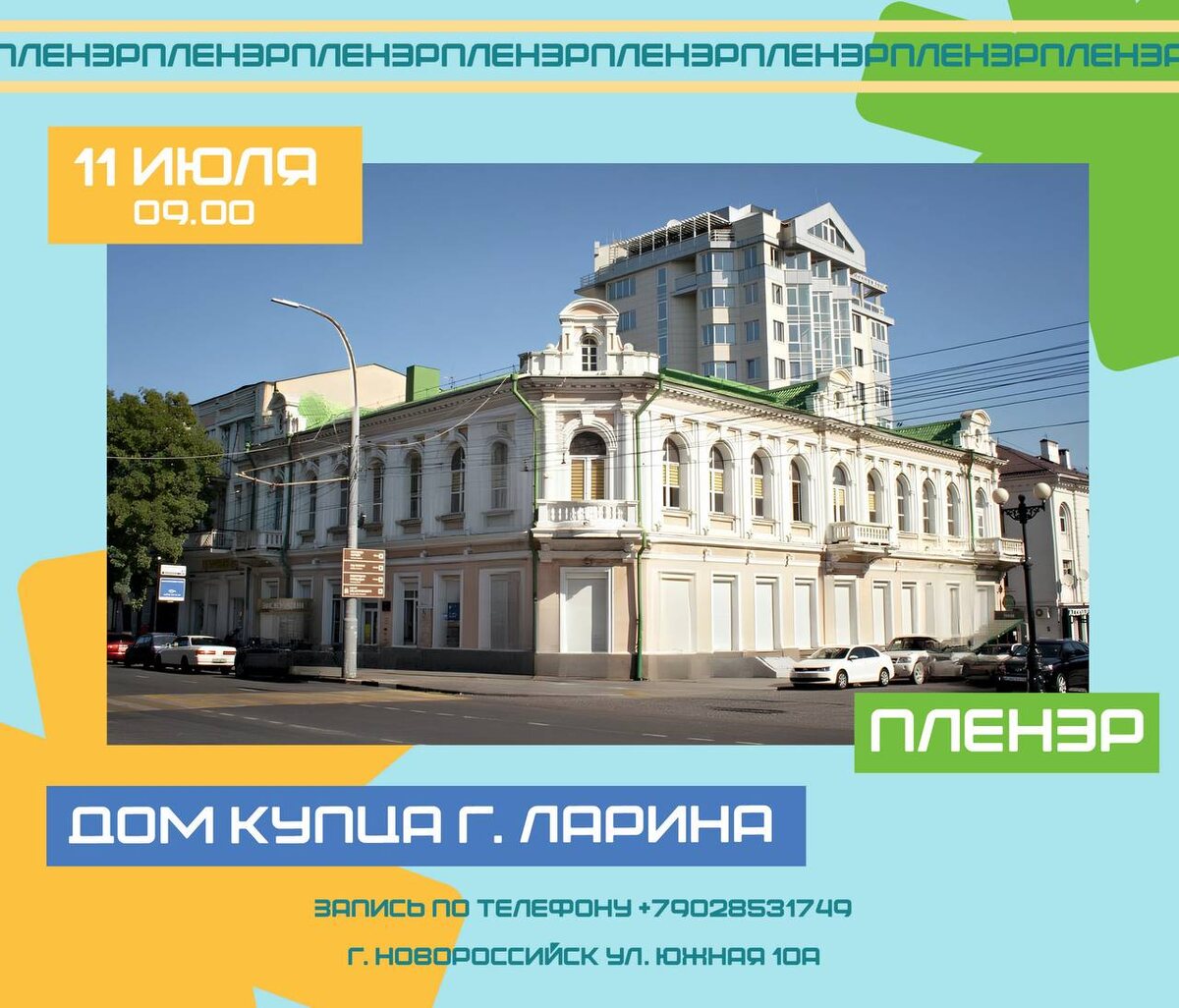🏛 Пленэр «Дом купца Г.Ларина» 😇 Приглашаем вас на творческую встречу на свежем воздухе! Встречаемся в нашей студии в 08:50, в 09:00 отправляемся на пленэр! Возвращаемся в 13:00, возможно и раньше. Под руководством опытного педагога будем с вами учится строить здания, передавать цвет! Друзья! Это будет очень интересно! Присоединяйтесь! 📍 Где будем творить: - 11.07 — Дом купца Г.Ларина ✅ Что взять с собой: - Бутылку воды - Головной убор - Верхнюю одежду (на случай прохлады) - Хорошее настроение! 🌧️ Важно! В случае плохой погоды (дождя) занятия будут проходить в нашей студии. ☎️ Запись по телефону: 8-902-853-17-49 8-918-064-65-00 📱 Запись онлайн: https://yandex.ru/business/widget/request/company/52017563801 📱 Мы находимся по адресу - г.Новороссийск, улица Южная 10А