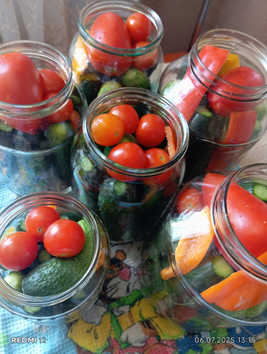 И вот сново наступил сезон заготовок. Подпевают ягоды, на росла зелень и на росли огурчики. А значит грядёт замолкает огурцов. Но я солю ассорти, нравится чтоб в одной баночки были разные овощи. У каждой хозяйки есть свой фирменный рецепт и конечно есть у меня, простой и вкусный, ассорти получается пальчики оближешь. Рецепт. На дно банки положить зелень:укроп, лист смородины, лавровый лист, чеснок, гвоздика, перец городком. По желанию хрен и сельдерей. Уложить огурцы, сверху ещё можно укроп. В эту банку сверху посыпать соль и сахар. на 3х-литр -3 ст.л соли+3 ч.л сахара на 2х-литр -2 ст.л соли+2 ч.л сахара на 1 литр - 1 ст.л соли +1 ч.л сахара Теперь залить кипятком, до самого верха. Положить сверху крышку. Постоять должно примерно 10-15 минут, слить эту жидкость из банки в кастрюлю. Довести до кипения. В банку с огурцами влить уксусную эссенцию: на 3 литр.банку-2 ч.л на 2 литр. банку-1÷1/3 ч.л на 1 литр. банку-2/3 ч.л И залить кипящий