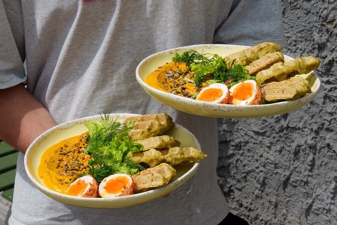 Что такое фалафля? Фалафля - вафля из нута и зелени, вдохновленная ближневосточной кухней. Ее придумали в вафельной ЖÖН. Хрустящая снаружи, мягкая внутри, подается с ярким морковным хумусом и яйцом со щепоткой шичими. К фалафле предлагают холодный чай масала с миксом специй. @foodiscovery