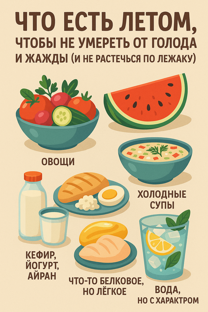 Лето — это когда ты вроде бы голоден, но жарко. И вроде пить хочется, но не просто воду, а что-то вкусненькое. И вот ты стоишь у холодильника, как у алтаря, и не знаешь, куда себя девать. Спокойствие. Вот список летней еды, которая одновременно освежает, насыщает и радует желудок — без тяжести, жары и угрызений совести. Хрустящие огурцы, сладкие помидоры, редиска, зелень, кабачки на гриле — это не диета, это летний гастро-спа. Хотите сытнее? Добавьте к овощам ложку оливкового масла и немного феты — вот вам и почти Греция на тарелке. Совет: держите овощи в холодильнике. Холодный огурец — лучше, чем вентилятор. На 92% состоит из воды, на 8% — из счастья. Арбуз утоляет жажду, насыщает сладким вкусом и заставляет вас на минуту поверить, что жизнь — не такая уж плохая штука. Важно: не совмещать с сыром и красным вином, если у вас в планах остаться дома, а не в приключениях ЖКТ. Окрошка (люблю и ненавижу одновременно), гаспачо, холодный борщ — всё это не просто супы, а летняя форма заботы