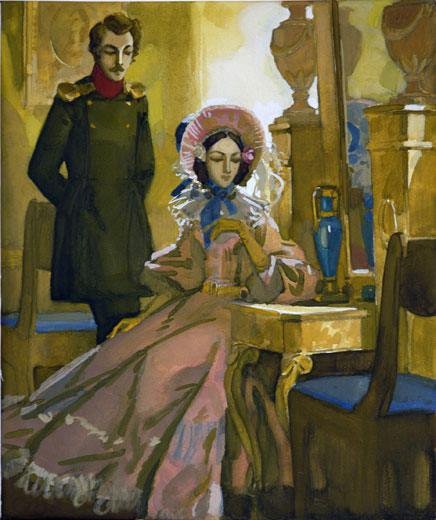 Викторина к 190-летию драмы «Маскарад» Продолжается наша викторина, приуроченная к 190-летию создания драмы «Маскарад». Ответ на вопрос, опубликованный в прошлом задании (Почему Звездич решил, что дамой в маске была Нина?): Нина рассказала, что на днях потеряла браслет. Сегодня предлагаем ответить на 5 вопрос викторины: Драма «Маскарад» оказала значительное влияние на романы второй половины XIX века. М.Ю. Лермонтову удалось создать целостную картину светской жизни: «Читал я нынче Гёте и Лермонтова драму, в которой нашел много нового, хорошего…». Кто автор этих строк? Где и когда они были написаны? Ответы ждем до 25 июля по адресу электронной почты ilyushina.tarhani@yandex.ru Изображение: Иллюстрация к драме М.Ю. Лермонтова «Маскарад». Нина и Звездич Панов В. П., 1981 год Бумага, акварель Из фондов Государственного Лермонтовского музея-заповедника «Тарханы»