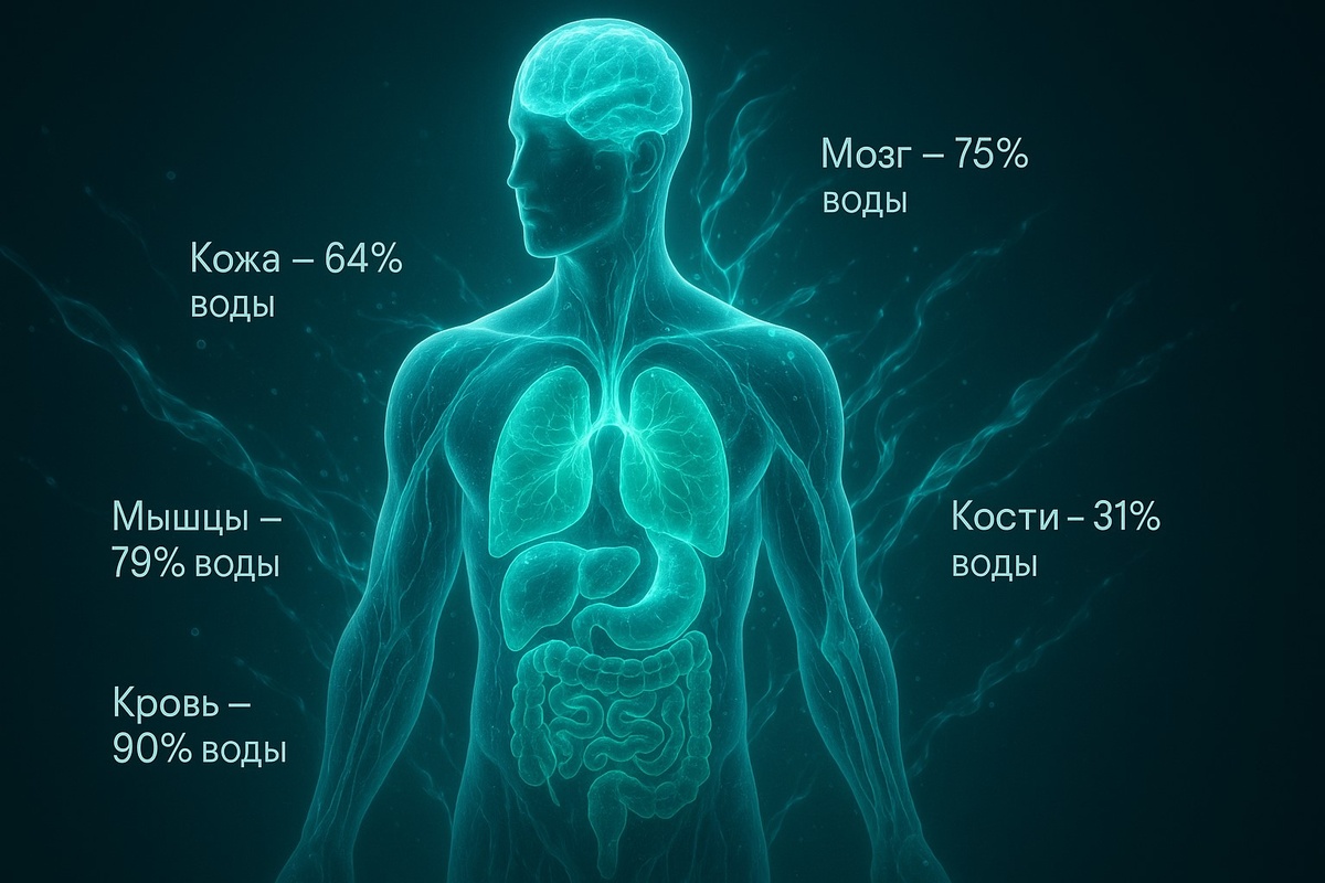 Мы часто слышим, что человек «на 75% состоит из воды», но что стоит за этим утверждением? Это не просто красивое сравнение, а биологическая реальность. Вода — это не компонент, это жизненная среда внутри нас. Она не просто «где-то там», она в каждой клетке, каждом органе и каждой функции тела. В среднем взрослый человек весом 70 кг содержит около 45–50 литров воды. Но она распределена по организму неравномерно: Когда вода уходит из тела — мы теряем не просто влагу, а нарушаем работу всего организма: Это объясняет, почему хроническое обезвоживание ведёт к усталости, набору веса, проблемам с сосудами и старению. Наше тело — это водная экосистема. Потеря всего 2% воды от массы тела уже снижает физическую и умственную активность. Поэтому фраза «пейте достаточно воды» — это не банальный совет, а ключ к здоровью, энергии и долголетию.