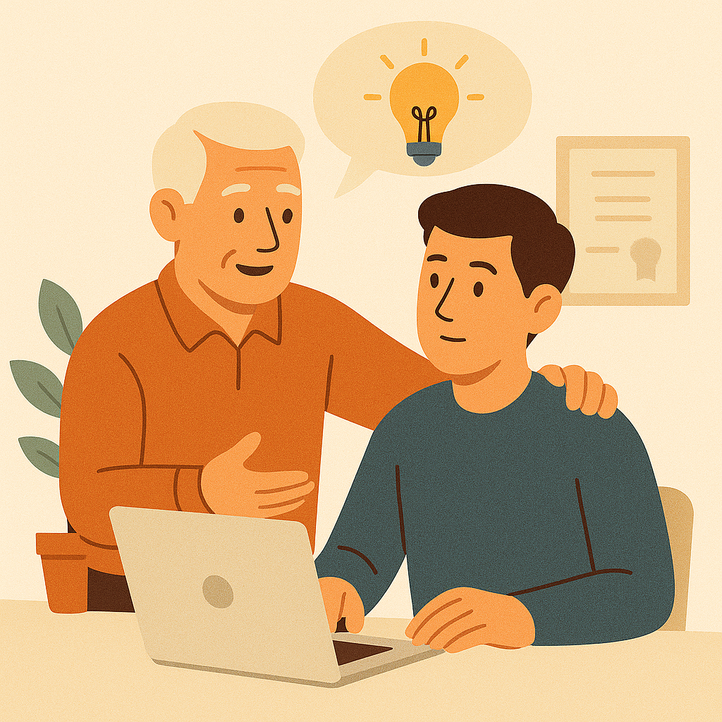 Подойдёт короткий 2–3-часовой онлайн- или офлайн-тренинг. Формат: разбор кейсов, сценки из жизни, работа в парах. Что делать, если наставляемый молчит? Как поддержать, если у человека паника? Как не перейти в менторское давление? Это практика, а не теория. Наставник должен почувствовать уверенность в себе и в том, что он — не один.