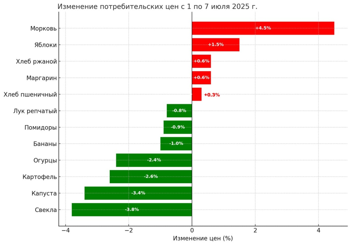 По оценке Росстата, индекс потребительских цен в период с 1 по 7 июля составил 100,79% (прирост 0,79% всего за одну неделю). Для сравнения, в июле 2024 года рост за аналогичный период был заметно ниже — 101,14%. Среднесуточный рост цен — 0,112%, что почти в 8 раз превышает майский показатель (0,014%). Основной вклад в инфляцию внесло повышение коммунальных тарифов: холодное водоснабжение подорожало на 14,88%, горячее водоснабжение и отопление на 13,8%, газ на 13,46%, электроэнергия на 13,0%. Среди продуктов питания мы видим разнонаправленную динамику. С одной стороны, подешевели овощи нового урожая: картофель на 2,6%, капуста на 3,4%, свекла на 3,8%. С другой стороны, есть рост цен на отдельные позиции: морковь подорожала на 4,5%, яблоки на 1,5%, маргарин на 0,6%, хлеб на 0,3–0,6%. ❗️Продовольственные товары первой необходимости, такие как яйца (-2,3%), рис (-0,5%), гречка (-0,3%), молоко (-0,1%), демонстрируют некоторое снижение, что говорит о сезонном смягчении ценовой нагрузки. Н