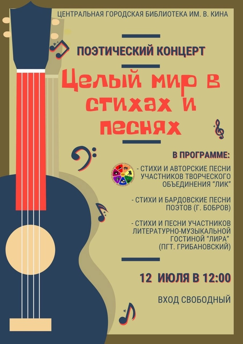 «Целый мир в стихах и песнях» — под таким названием в центральной городской библиотеке им. В. Кина состоится поэтический концерт с участием борисоглебских поэтов, музыкантов, а также гостей города. 12 июля в 12.00. Вход свободный.