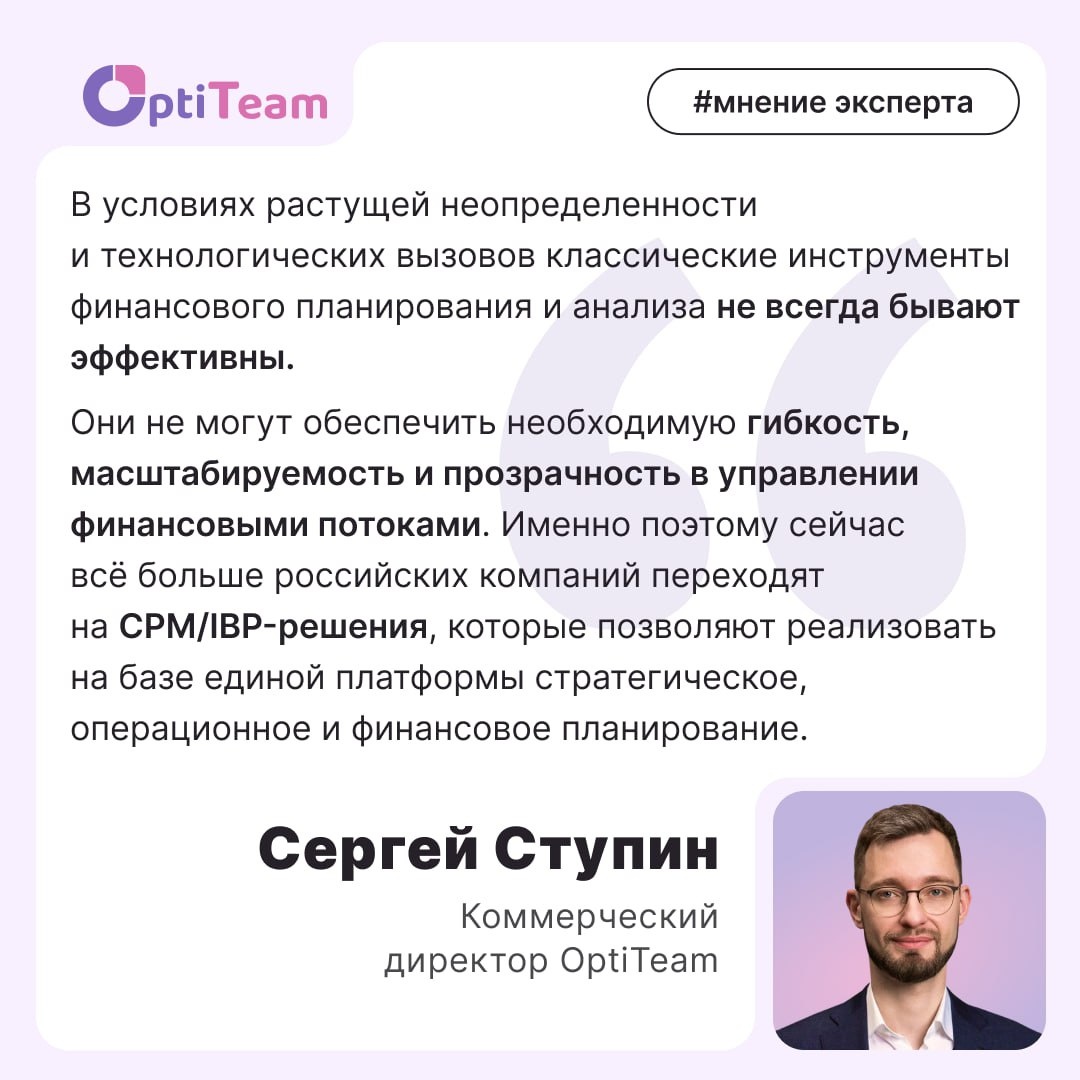 Финансовое планирование и анализ — основа устойчивого развития компании. Когда рынок нестабилен, а решения нужно принимать здесь и сейчас, автоматизация этих процессов становится особенно ценной. Сергей Ступин, коммерческий директор OptiTeam, рассказал Comnews, как: 🔴 перейти от классического планирования к гибкому; 🔴 повысить точность прогнозов; 🔴 ускорить подготовку отчетности; 🔴 эффективно решать проблемы, с которыми сталкивается бизнес сегодня. Также в статье вы узнаете, какие «ред флаги» сигнализируют о том, что бизнесу пора переходить на современные и мощные инструменты планирования. В конце, как обычно, реальные кейсы автоматизации планирования — в крупном российском банке и в сети магазинов фиксированных цен. 👉 Читать статью #OptiTeam #Optimacros #полезное #мнение_эксперта #cpm #ibp