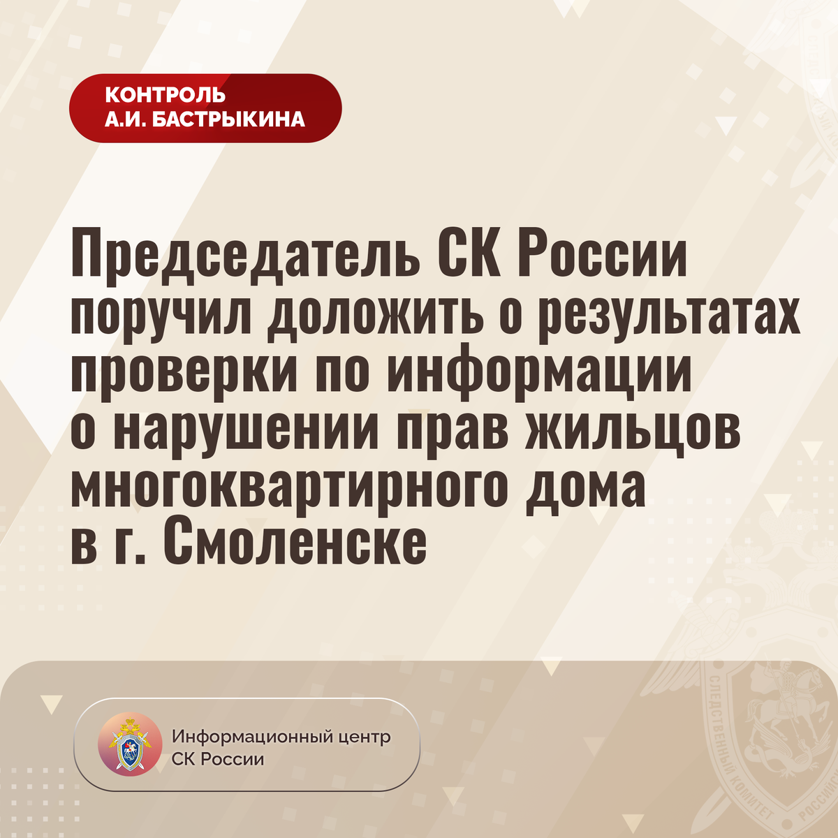 Председатель СК России поручил доложить о результатах проверки по информации о нарушении прав жильцов многоквартирного дома в г. Смоленске В эфире федерального телеканала сообщалось, что в многоквартирном доме по улице Попова в городе Смоленске между этажами произошла аварийная остановка лифта, в кабине которого находились три человека, в том числе малолетний. Ввиду несоблюдения сотрудником обслуживающей организации правил безопасности при эвакуации мужчина ударился о конструкцию, получив травму головы. В СУ СК России по Смоленской области по данному факту организована процессуальная проверка. Председатель Следственного комитета Российской Федерации Александр Иванович Бастрыкин поручил и.о. руководителя СУ СК России по Смоленской области Андрею Сергеевичу Киселеву доложить о предварительных и окончательных результатах процессуальной проверки. Исполнение поручения, а также ход процессуальной проверки поставлены на контроль в центральном аппарате ведомства. #СледственныйКомитет #СКРосси