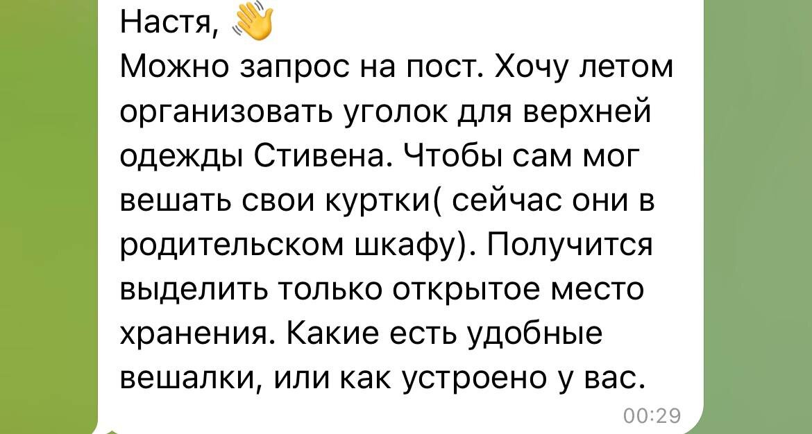 У нас в прихожей вся верхняя одежда дочери весит на самоклеящихся крючочках. Вообще, это универсальная вещь- и одна из классных фишек по обустройству дома по Монтессори. Почему? Потому что с ними можно создать среду для ребёнка более доступной, и потратив при этом не больше 200₽. Такие крючки мы можем разместить на уровне глаз ребёнка: В прихожей: чтобы повесить курточку На кухне: чтобы повесить тряпочку, которой малыш будет вытирать пролитое, или веник с совочком. В ванной: чтобы повесить полотенце для вытирания рук/лица или маленькое зеркало. После таких нововведений, вы заметите,как ребёнок: ⏺️Станет охотнее одеваться самостоятельно, ведь курточку он может снять с крючка и попробовать надеть САМ. ⏺️С большим энтузиазмом побежит на кухню и возьмет тряпочку и вытрет пролитую лужу тоже САМ. ⏺️А так же умываться ему будет интереснее, если за всем процессом он сможет наблюдать в СВОЕ зеркало и вытираться СВОИМ полотенцем. Попробуйте применить такой лайфхак, и жизнь ребёнка