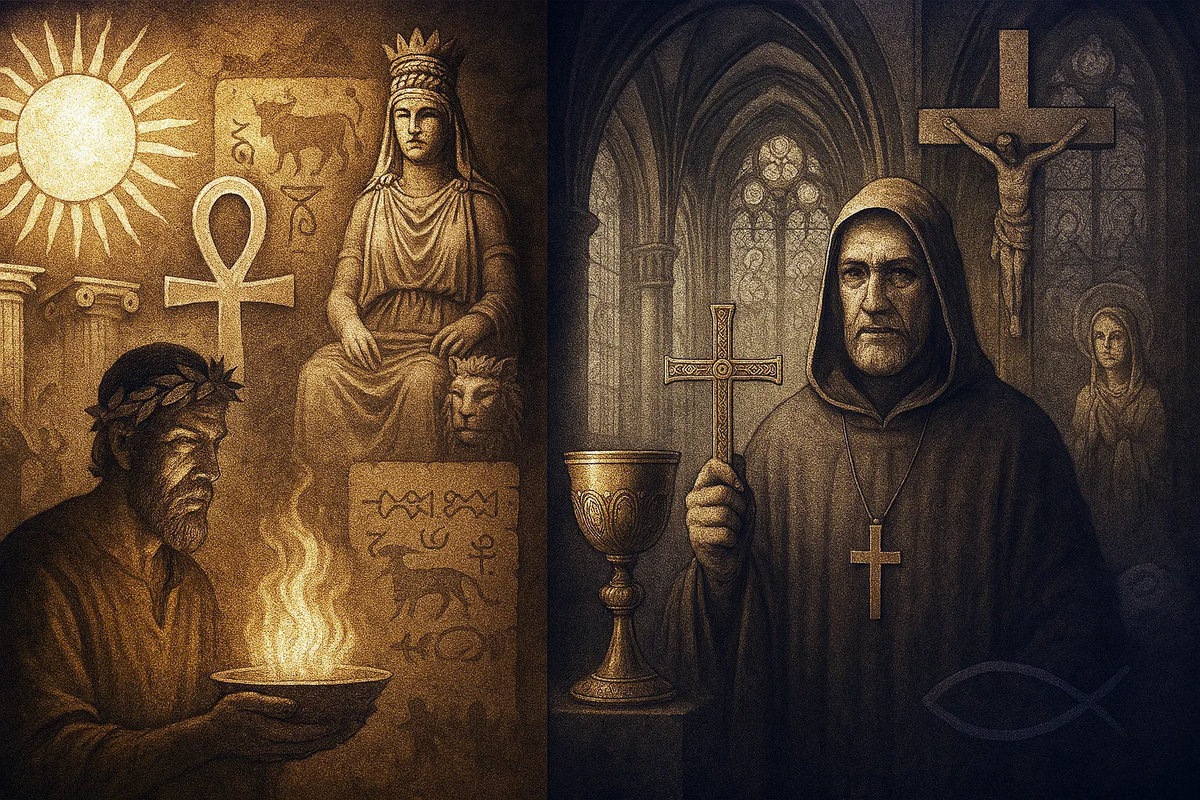 Представьте, что вы строите дом из старых кирпичей. Вы не изобрели эти кирпичи — но они всё равно определяют, каким будет здание. Христианство унаследовало мир, уже сформированный греко-римскими мифами, персидским дуализмом, египетскими ритуалами и разнообразными мистическими культами. Даже если оно заявляло, что является чем-то новым — оно пришло с кучей переработанного материала.