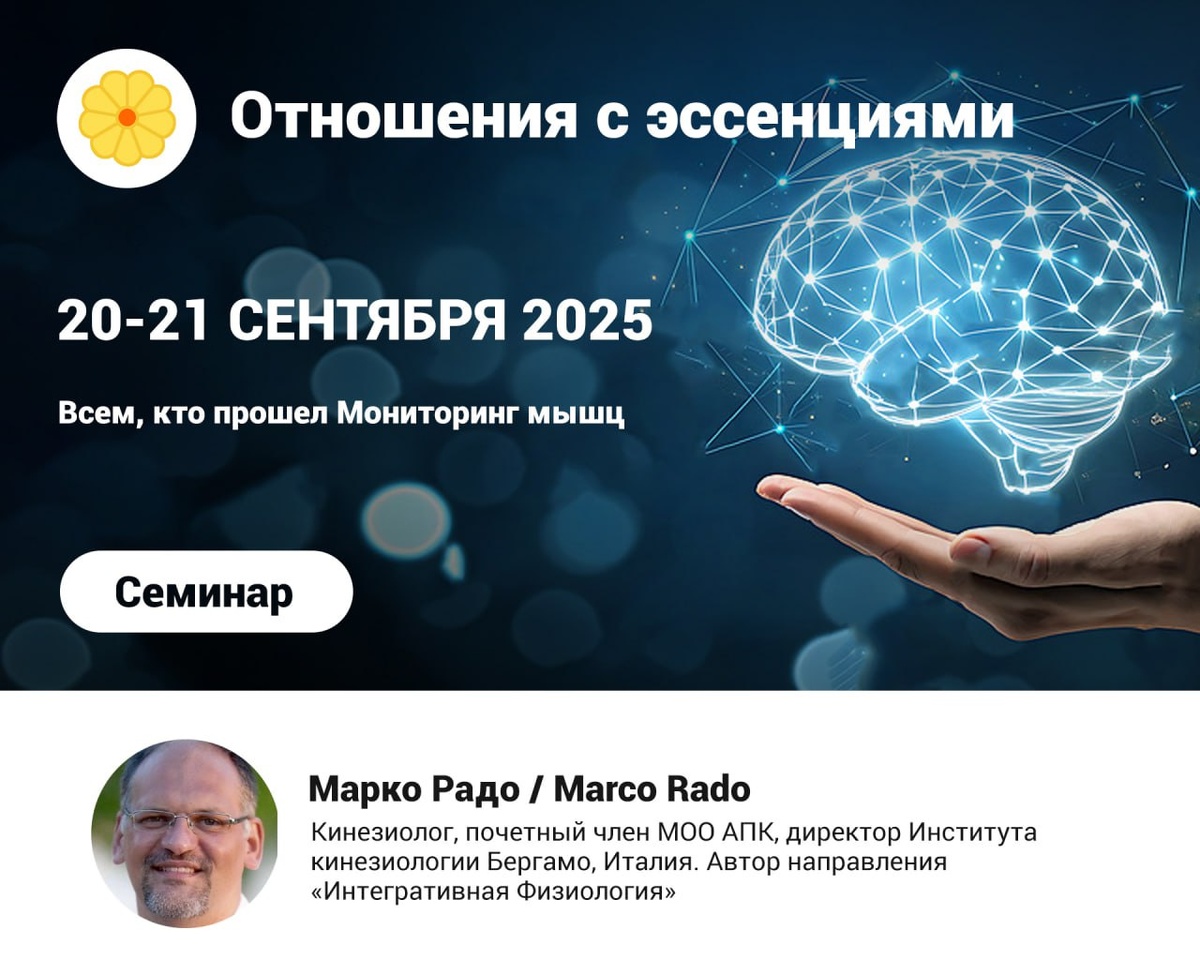 Дорогие друзья!🌿 Приглашаем Вас на семинар "Отношения с эссенциями", который будет проведен с 20 по 21 сентября 2025 года Семинар проводит Марко Радо — Кинезиолог, директор Института кинезиологии(Италия) Это семинар полной программы обучения Прикладной физиологии ☝️ На этом двухдневном семинаре начинающий специалист по наблюдению за стрессом познакомится с концепцией закона Ома (закон электричества) и его отношением к голографической супертеории 💫 Люди понимают его реальность, когда наблюдают действие этого закона. Эта реальность проявляется через отношения, мысли, чувства. Сознание, подсознание и бессознательный уровень стимулируются посредством позитивных утверждений, цветочных эссенций и звуковых вибраций камертонов, настроенных на скрытые воспоминания Подробнее о семинаре можно узнать в личных сообщениях группы ВК или по ссылке — https://kinesioportal.ru/events/2532/4737.php