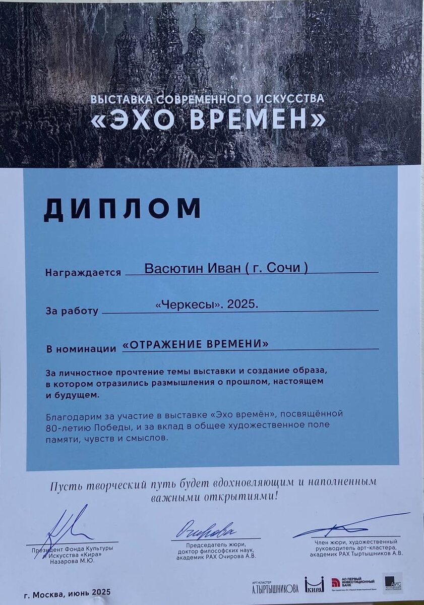 ➡ Участников выставки «Эхо времен» наградил Герой Советского Союза Валерий Очиров Наш большой проект, посвященный памяти Победы, завершился церемонией награждения участников. Особым гостем стал Герой Советского Союза, генерал-лейтенант Валерий Очиров. - Я хочу поблагодарить и детей, и взрослых, и организаторов за этот проект. Поскольку он посвящен значимому событию – историческому факту победы Советского союза над фашистской Германией. Мы сегодня являемся носителями этой истории, и очень важно, чтобы молодое поколение знало и не забывало о святой памяти, о наших дедах и отцах, - обратился к гостям церемонии Валерий Николаевич. Выставка, организованная Фондом «Кира» при поддержке АО «Первый Инвестиционный Банк», объединила более 35 авторов из городов-героев и городов воинской славы, а также юных художников из Москвы. В экспозиции были представлены живопись, графика, скульптура и видео-арт, раскрывающие тему памяти о войне. В церемонии участвовали художественный руководитель Арт-клас
