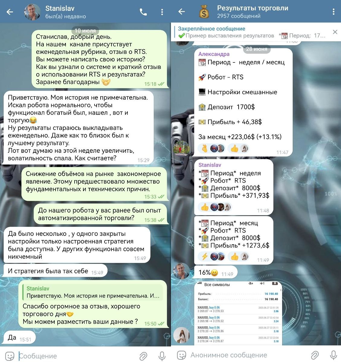 💬История Станислава: «Нужен был нормальный робот — нашёл, подключил, торгую» ВСЕ ОТЗЫВЫ ➡️ #отзывыRTS #RTS #отзывыRTS #историяпользователя #трейдинг #опыт Каждый четверг мы публикуем истории пользователей RTS. Сегодня Станислав, один из тех, кто искал не "волшебную кнопку", а рабочий инструмент с гибким функционалом. Ничего особенного. Искал робота, чтобы функционал богатый был. Нашёл , подключил. Торгую. До RTS у Станислава уже был путь в мире автоматической торговли: Да, пробовал нескольких. У одного настройки были закрыты, можно было только выбрать готовую стратегию. У других функционал совсем никакой. И стратегия была так себе. RTS стал другим опытом: ✅Настраиваемая логика ✅Прозрачность и управление рисками ✅Регулярная публикация результатов ✅И главное возможность адаптироваться под рынок. Даже как-то был близок к лучшему результату недели. Сейчас вот думаю лот увеличить волатильность спала. 📊Такой подход — это и есть сила RTS: не угадывать, а подстраиваться под рын
