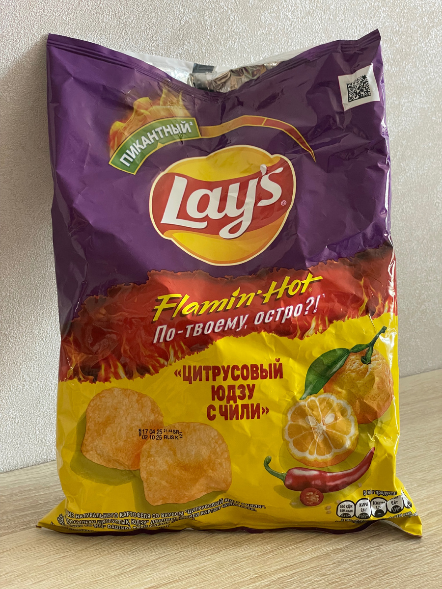 Новинка от Lays, как всегда, таит в себе тайны. Я, в своей безграмотности, не знаю, что такое юдзу, но попробовать хочу. Спонсор сегодняшнего обзора — я сам, а покупал я чипсы в магазине "Магнит". Пачка чипсов как бы намекает, что в руках у меня пикантная штучка и задает вопрос: "По-твоему остро?" Отрываю пачку, смотрю содержимое. Внутри присутствует характерная пустота, а запах приятный: перчик с чем-то кисленьким. Окунаю руку, загребаю сразу несколько долек. Пробуем. На вкус напоминает том ям, но не такой острый. Не сказал бы, что они оправдали свою заявку на пикантность, продолжаем есть дальше. Ощущается кислость — видимо, юдзу и есть этот цитрус. Острота так и не появилась даже через 5-7 минут поедания картофельного изделия. В сочетании с квасом в жаркий день они будут вполне неплохи. Буду ли я покупать еще? Думаю, нет. Ставлю 6/10 лимонов. По остроте — 2/10 перчиков. Состав чипсов: • Картофель • Подсолнечное масло • Приправа с юдзу (порошок юдзу, соль) • Чили (порошок) • Специи