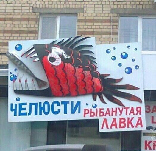 Смешные вывески часто становятся объектами шуток благодаря креативному подходу к названиям, игре слов или неожиданным визуальным решениям. Вот некоторые, вызывающие улыбку своей оригинальностью: Игра слов и опечатки «Абырвалг» — магазин в Екатеринбурге, название отсылает к повести «Собачье сердце». «Не кури» — вейп-шоп, где ирония названия подчеркивает противоречие между запретом и продажей никотиновой продукции. «Жратьсберг» — кафе с меню, где бургеры названы в стиле «Во все тяжкие». Абсурдные фразы и визуалы «Все! Я съем все!» — вывеска с котом, который символизирует аппетит заведения. «Аквамен завидует» — реклама подводного ранца, обыгрывающая супергеройский образ. «Кошка, не входи!» — предупреждение в магазине, где вместо «Котам вход запрещен» использована игривая форма. Опечатки и каламбуры "Продуктовый магазин от модного дома"-ошибка стала частью юмора. «Вниманию собак: ррррр, гав, вуф» — табличка с «переводом» для питомцев. Креативные названия заведений «Чебуречество в опасност