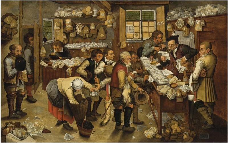 Питер Брейгель Младший, «Крестьяне у сборщика налогов», 1640 г. На картине изображен адвокат, который принимает жалобы крестьян на какие-то непомерные действия, которые с ними совершают власти. В конторе сидит человек, облаченный в красное (красный цвет считался символом власти), в черном головном уборе, с длинной бородкой который подбоченившись читает некий документ, который ему принесли. Внимательно всматриваясь в документ и удерживая кипу бумаг другой рукой, он внимательно выслушивает просителя, стоящего рядом с ним. Он с надеждой ждет что ему скажет адвокат, поможет или нет. Рядом стоит видимо его работник, ждущий указаний. Крестьяне, которые пришли к нему приносят самые разные продукты: один несет виноград, другой несет битую птицу. Крестьянка из специальной корзины для яиц перекладывает яйца в маленькую корзиночку. Сдают ли они таким образом налоги или же они просители и приносят адвокату оплату за его труд натуральными продуктами - неясно.