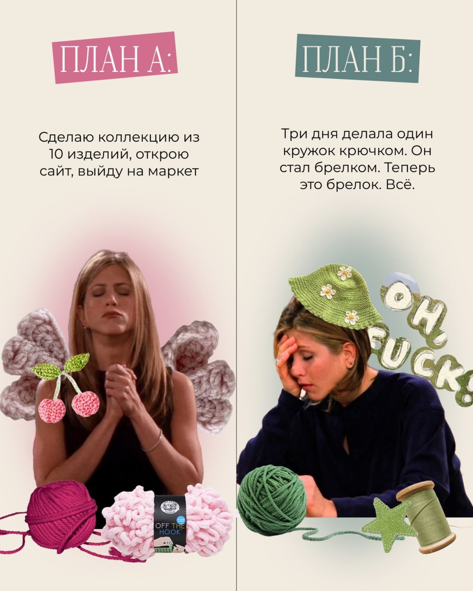 Чтобы всё шло по плану (желательно по плану А), доверьте обучение творчеству «Мастер Поделкин»! Научим любым видам арт-практик, чтобы реализовать ваши амбиции! А пока предлагаем посмеяться над гипотетическими ситуациями в наших карточках: пусть поделки не всегда получаются с первого раза — мы сделаем так, чтобы даже первые попытки вас не разочаровали 🧡