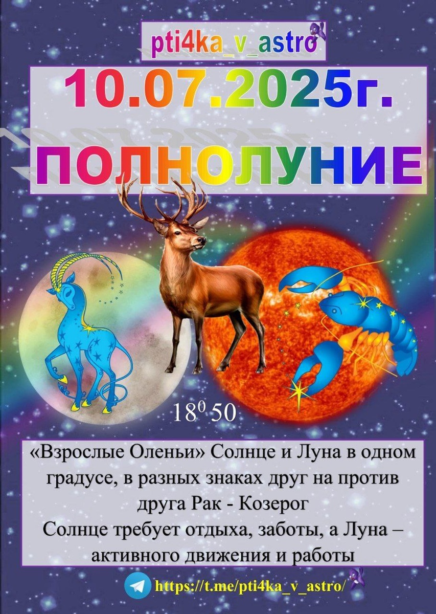 ☀️ Июльское Полнолуние 🌕 🗓️ 10.07.2025г. в 23:35 мск ☀️♋ Солнце находится в семейном и домашнем знаке Рак 🌙 ♑ Луна - в холодном и ответственном знаке Козерог 👔 Хорошее время завершить рабочие процессы, чтобы быть свободным от рабочего процесса И в удовольствие провести время в кругу близких и любимых людей 🏡 🌕 Солнце в Раке - в слабом положение, постарайтесь не перенапрягать себя Расслабляйтесь и отдыхайте, начните двигаться - движение жизнь Подойдут зарядка, растяжка, прогулки 🍊Обратите внимание: 🦷 на кости, позвоночник, суставы, зубы, колени, желудок, матку и грудь Принимайте витамины, могу помочь в выборе, обращайтесь 💆♀️ Начните на постоянной основе делать зарядку, растяжку, ходите на массаж - могу посоветовать массажиста 💧Следите за питьевым балансом, режимом сна и отдыха 🛌 💊 Принимайте витамины и таблетки правильно, за подробной информацией пишите @pti4kaVastro 🌙 Кто все ещё хочет "прокачать" Луну или узнать Волшебные практики Луны, пишите Всем хорошег