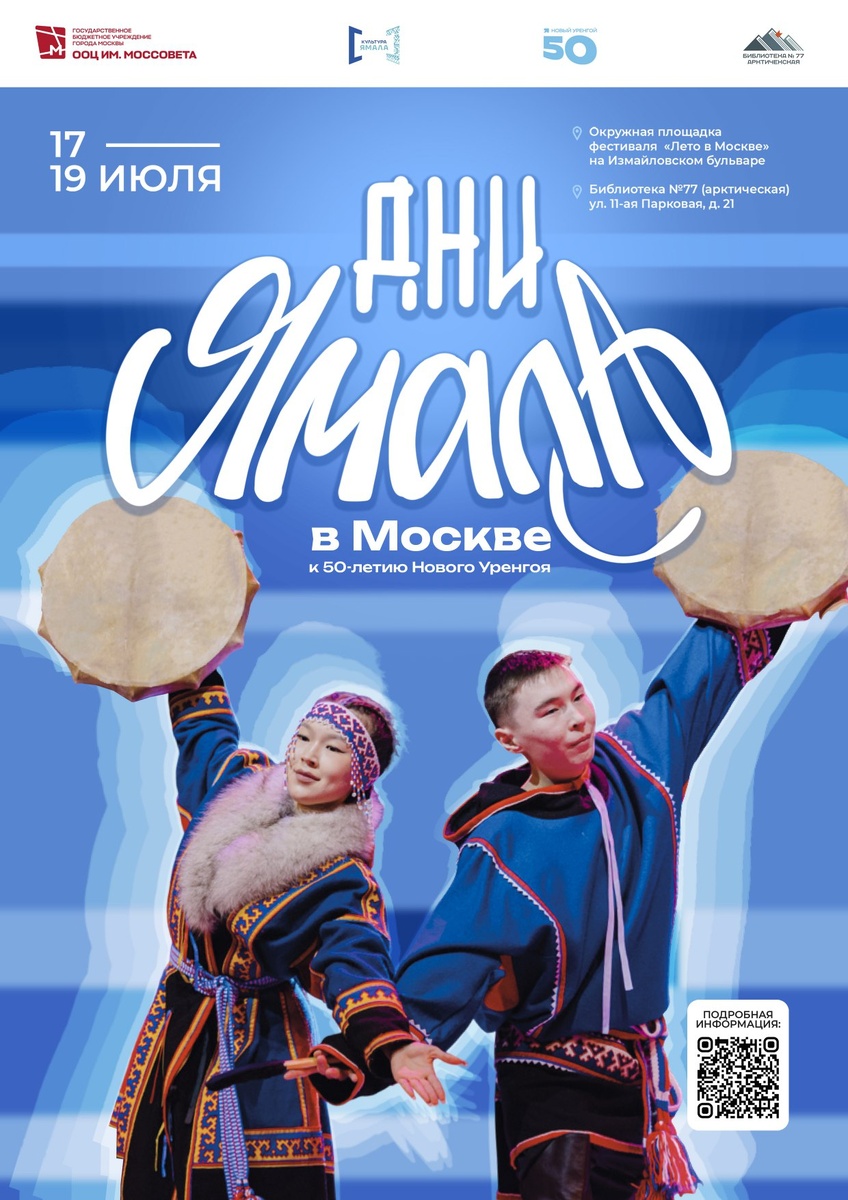 ДНИ ЯМАЛА В МОСКВЕ! Окружной Центр национальных культур представит в столице нашей страны самобытную культуру коренных малочисленных народов Севера. Жители и гости Москвы познакомятся с песенным фольклором ненецкого народа, традиционными народными играми и национальными видами спорта. Насыщенная программа дней будет наполнена различными мастер-классами: игра на музыкальных инструментах, созданием оберегов, магнитов, подвесок и браслетов с национальными мотивами. Ярким событием станет концертная программа «Пусть звучат песни народа моего...» с участием артистов Окружного Центра национальных культур – Нядмы и Масне Няруй и солистов ненецкого фольклорного ансамбля «Вы’сей». Дни Ямала в Москве приурочены к празднованию 50-летия Нового Уренгоя. Мероприятия пройдут на Измайловском бульваре и в библиотеке № 77 - Арктическая (ул. 11-ая Парковая, д. 21). Подробнее с программой можно ознакомится по q-коду, расположенному на афише.