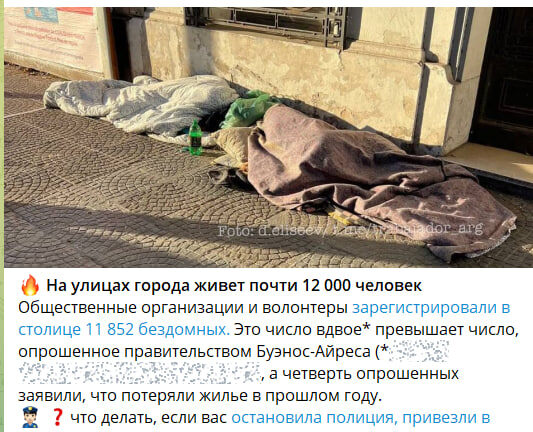 🔥 На улицах города живет почти 12 000 человек Общественные организации и волонтеры зарегистрировали в столице 11 852 бездомных. () Это число вдвое* превышает число, опрошенное правительством Буэнос-Айреса (*видимо "официальная статистика" - АР), а четверть опрошенных заявили, что потеряли жилье в прошлом году. 👮🏻 ❓что делать, если вас остановила полиция, привезли в участок полиции -обсудим (https://t.me/trabajador_arg/5478) с адвокатом