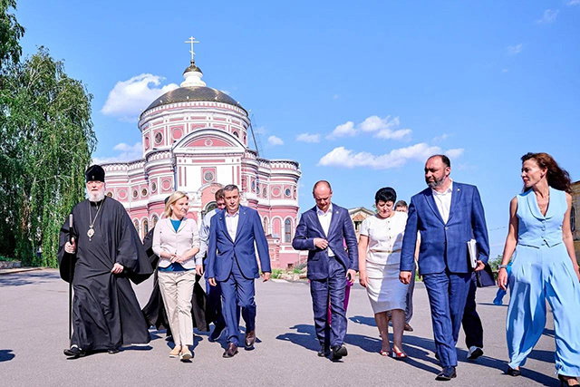 Потом Любимову повели на территорию Знаменского монастыря, где ее встретил митрополит Курский и Рыльский Герман. Кафедральный собор сейчас на ремонте, поэтому зашли в отремонтированный несколько лет назад Воскресенский храм. Затем показали всю территорию крепости. Используя для наглядности макеты, на которых Курск в миниатюре представлен в разные периоды, коротко рассказали историю города, после чего поделились, как восстановленные исторические здания планируется использовать.