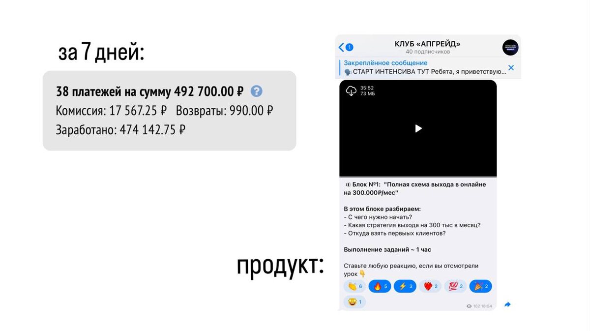 Очень простая связка! 😮💨😮💨😮💨 470.000₽ чистыми принесло))) Задача: Находим эксперта с охватами от 500-1000 или свой блог, который вы ведете. (Подойдет на самом деле любой блог, в котором есть аудитория) P.S. Если нашли эксперта, то договариваетесь на 30-40% от продаж с его блога Шаг №1: Придумываем мини-продукт (клуб/сообщество/мини-курс) с сумасшедшей ценностью Шаг №2: Грамотно создаем такой продукт. Я рекомендую вам для начала сделать его за 990-2990 руб, чтобы уже реально было что продавать. Я сейчас дошел до 12-13 тыс руб, но буду возвращаться к 5-7 тыс. Самое трендовое для вас — это запустить сейчас клуб по подписке на одну тему. Шаг №3: Делаем прогрев в сторис/рилс/постах/тг канале и вообще везде-везде, чтобы люди захотели купить такой ценный продукт Шаг №4: Продаем 5-7 дней в блоге / в директе / на личной встрече и т.д. Вуаля! У вас 200-400 тыс в кармане! Такая связка работает на любом блоге и в любой нише. Даже если вы с нуля, то сделаете первые 20-50 тыс) А