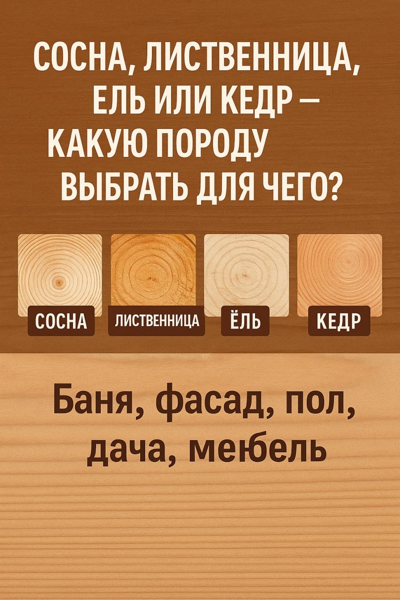 Выбираете древесину для стройки, ремонта или отделки? Сразу возникает вопрос: какую породу брать — сосну, лиственницу, ель или кедр? Все они — популярные, доступные и проверенные. Но у каждой — свои «сильные стороны» и зоны, где она не справится. Разбираем по целям: баня, фасад, пол, дача, мебель. Для бани: кедр, осина или липа? А как насчёт сосны? Баня — это жара, влага и перепады температур. Не каждая доска выдержит такое испытание. Кедр — идеален для полков и стен. Он почти не нагревается, пахнет божественно, обладает природными антибактериальными свойствами. Но и стоит прилично. Сосна — годится для предбанника, стен и потолков (не для парной!), но при сильном нагреве выделяет смолу. Ель — немного меньше смолы, но тоже не в парную. Отлично подойдёт для обшивки. Лиственница — в парилке слишком «жёсткая», но для пола и полков в предбаннике подходит идеально: не гниёт, не боится влаги. Вывод: 👉 Кедр — для парной, лиственница — для пола, сосна и ель — для отделки остальных зон