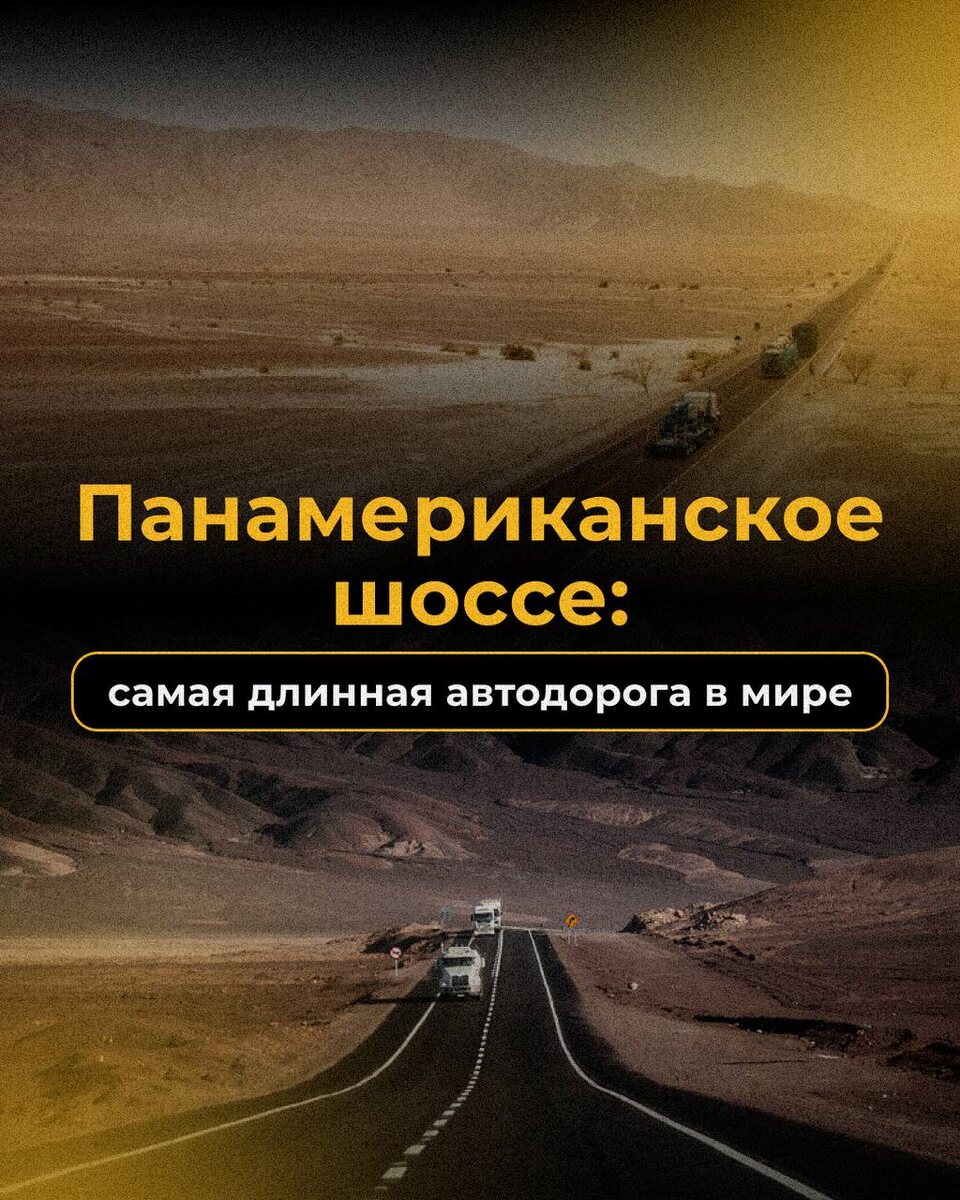 Представьте дорогу, которая объединяет два континента и 14 стран! Панамериканское шоссе — рекордсмен Книги Гиннесса: • 30 000 км — от ледяного Прудхо-Бей (Аляска) до Огненной Земли (Аргентина/Чили) • 9 климатических зон — от арктических пустынь до тропических джунглей • 11 322 м перепада высот — выше Эвереста! Где заканчивается шоссе? В Дарьенском ущелье (граница Панамы и Колумбии). Через него не проходит ни одна дорога, и не ходят автомобильные паромы. Водители часто предпочитают отправлять свои машины грузовым судном из одной страны в другую. Кто готов на такое приключение?