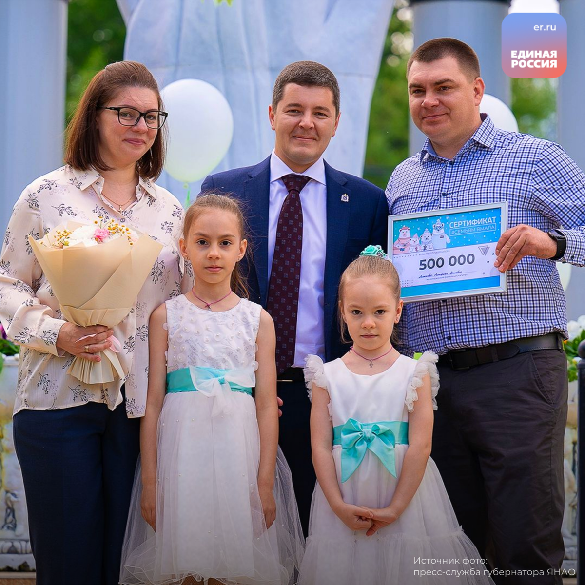 Губернатор Ямала, секретарь регионального отделения партии «Единая Россия» Дмитрий Артюхов в этот день вручил три свидетельства на региональный материнский капитал жителям Салехарда: семье Ивановых, семье Лесенковых и семье Созоновых. Церемония прошла в Сквере влюбленных.