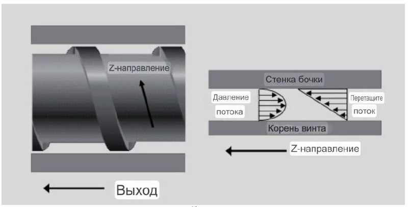Перекачка расплава: ключевой процесс в экструзии!🔥 Ближе к концу переходной секции шнека заканчивается плавление, и начинается важная функция — перекачка расплава. Эта функция отвечает за перемещение расплава к выходу из экструдера и создание давления, необходимого для преодоления сопротивления потоку через головку и матрицу. ⚙️Как это работает? Расплав движется через дозирующую секцию шнека благодаря сочетанию потоков сопротивления и давления. Трение между цилиндром и расплавом влияет на движение полимера, "перетаскивая" его вперед к матрице. Однако давление в расплаве также толкает полимер назад в канале. Вот как это выглядит: - Сопротивление вперед - Давление назад Важно, что в среднем сопротивление вперед преобладает, что и позволяет полимеру выходить из матрицы, несмотря на возможное обратное движение в нижней части канала. 🔄 Спиральное движение расплава Элементы расплава движутся по сложному пути через секцию дозирования: ✔️Сперва они проходят вниз по потоку. ✔️Затем ста
