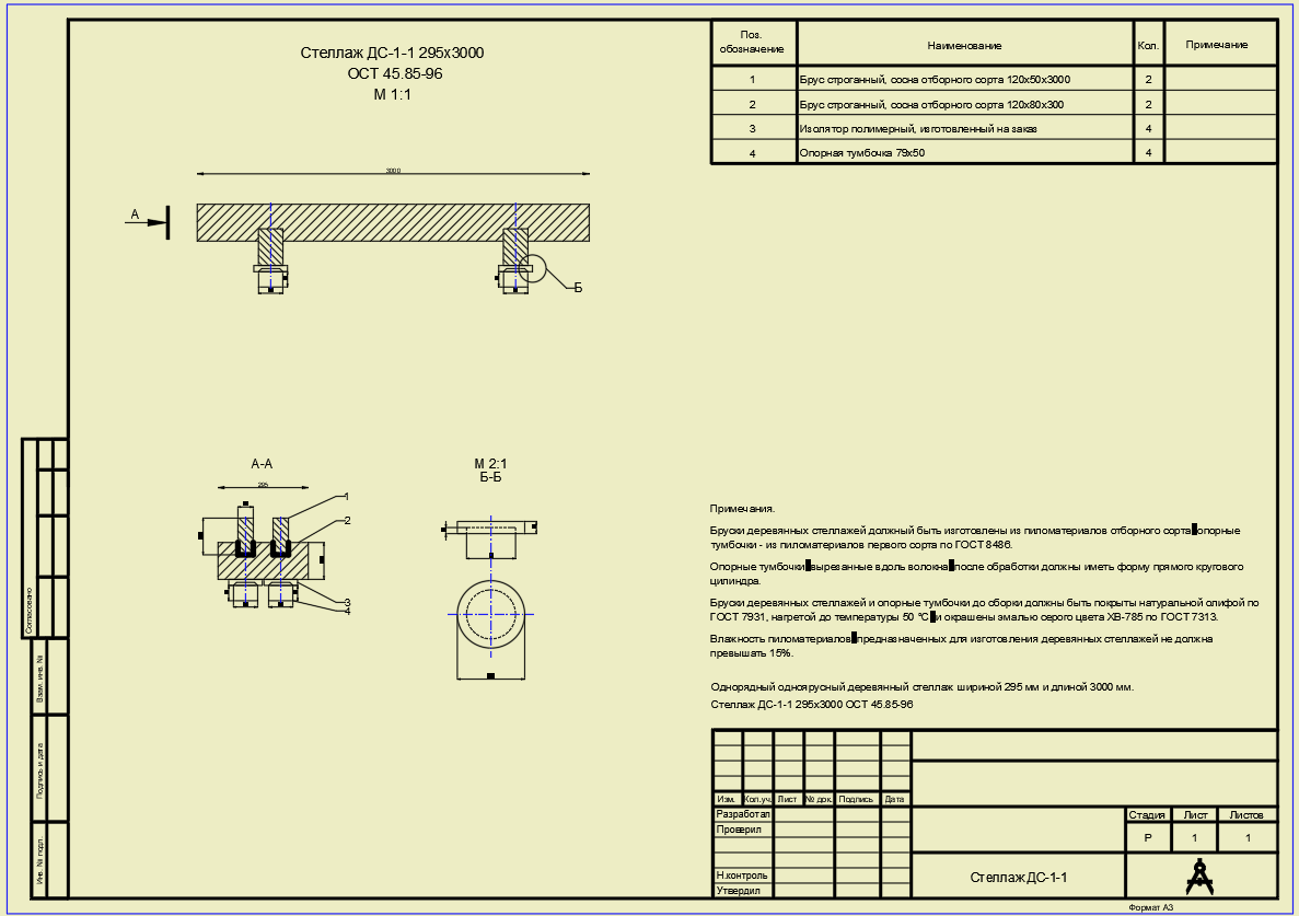 Стеллаж ДС-1-1 предназначен для стационарной установки аккумуляторов на предприятиях связи. · ДС — деревянный стеллаж · 1-1 — однорядный, одноярусный · 295х3000 — ширина и длина стеллажа в миллиметрах · ОСТ 45.85-96 — стандарт изготовления · Тип конструкции: деревянный стеллаж · Количество рядов: 1 · Количество ярусов: 1 · Ширина: 295 мм · Длина: 3000 мм · Климатическое исполнение: УХЛ для категории размещения 4.2 по ГОСТ 15150 Стеллаж предназначен для установки: · Свинцовых аккумуляторов типов от СК-1 до СК-68 · Свинцовых аккумуляторов типов от СКЭ-16 до СКЭ-68 · Свинцовых аккумуляторов закрытого типа · Щелочных аккумуляторов емкостью до 125 А·ч · Бруски: изготавливаются из пиломатериалов отборного сорта · Опорные тумбочки: изготавливаются из пиломатериалов первого сорта по ГОСТ 8486 · Допуски размеров: o ±2 мм по толщине и ширине брусков o ±3 мм по длине брусков o ±2 мм по диаметру опорных тумбочек o ±2 мм по высоте опорных тумбочек · Опорные тумбочки имеют форму прямого кругового ци