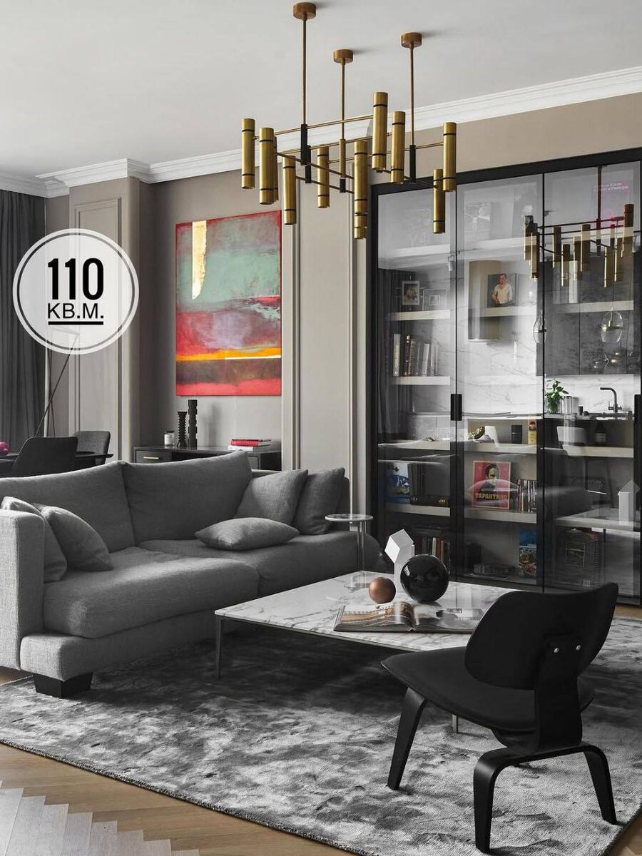Трёхкомнатная квартира общей площадью 110 кв.м. «Заказчик — яркий, харизматичный мужчина — работает в сфере организации концертов звезд мировой эстрады. Ему хотелось комфортный, эргономичный, современный интерьер с яркими акцентами и элементами классики. Также он просил сделать достаточно систем хранения и использовать благородные натуральные материалы и палитру в темных, насыщенных оттенках. Все это и стало отправной точкой для работы над этим проектом.» Как вам интерьер? 💫 #интерьерпример