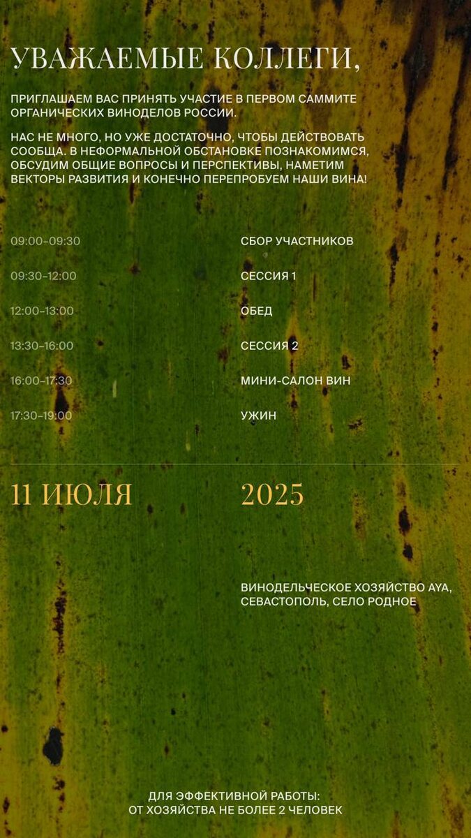 Дорогие виноделы, с органическим сертификатом. 11 июля в ресторане «Aya» в Родном мы делаем встречу, форсайт-сессию, где познакомимся, пообщаемся, поймем, что нам можно делать и как, что улучшить. Переходите по ссылке, регистрируйтесь. Ждем вас в 9 утра на целый день. До встречи!