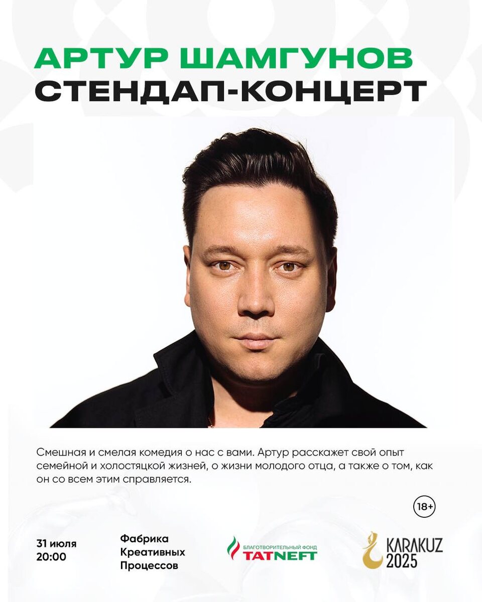 С 31 июля по 2 августа в городе Альметьевск пройдёт Юмористический уикенд в рамках фестиваля KARAKUZ❤️🔥 Знакомимся мероприятиями этого масштабного события🙌🏻 ✨Что? Stand-up концерт Артура Шамгунова ✨Когда? 31 июля в 20:00 ✨Где? Фабрика креативных процессов, ул. Ризы Фахретдина, 50 Концерт Артура Шамгунова. Смешная и смелая комедия о нас с вами. Артур расскажет свой опыт семейной и холостяцкой жизней, о жизни молодого отца, а также о том, как он со всем этим справляется🙌🏻 UPD: SOLD OUT|Билеты распроданы ВОЗРАСТНОЕ ОГРАНИЧЕНИЕ 18+. Все мероприятия Юмористического уикенда можно найти здесь: https://standupkzn.ru/