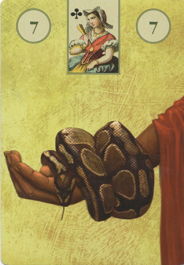 Воистину, злей не придумаешь... Итак, перед нами карта номер 7 в системе Ленорман. Дама треф всегда изображается в углу карты и ооочень сильно влияет на происходящий расклад, обращайте на неё внимание!! Вообще тема игральных карт и их странный симбиоз с Ленорман предмет отдельной диссертации) Как они странно спелись между собой и играют немного иначе, чем когда делают расклад на игральных картах самостоятельно. Дама треф подсказывает нам, что в деле будет женщина возрастная, опытная, возможно вдова или разведённая, с не самым простым характером! Очень часто змея показывает свекровей, тёщ, начальниц, любовных соперниц и конечно женщин с очень яркими экстрасенсорными, магическими способностями! Это если мы смотрим людей или конкретные персоны важны в вашем раскладе. Но бывает, что Змея показывает чисто бытовые истории, о которых так сразу и не подумаешь, ведь мы прочно ассоциируем карты только с любовными историями. А может показать и садовый шланг, который в день расклада стал испорчен-