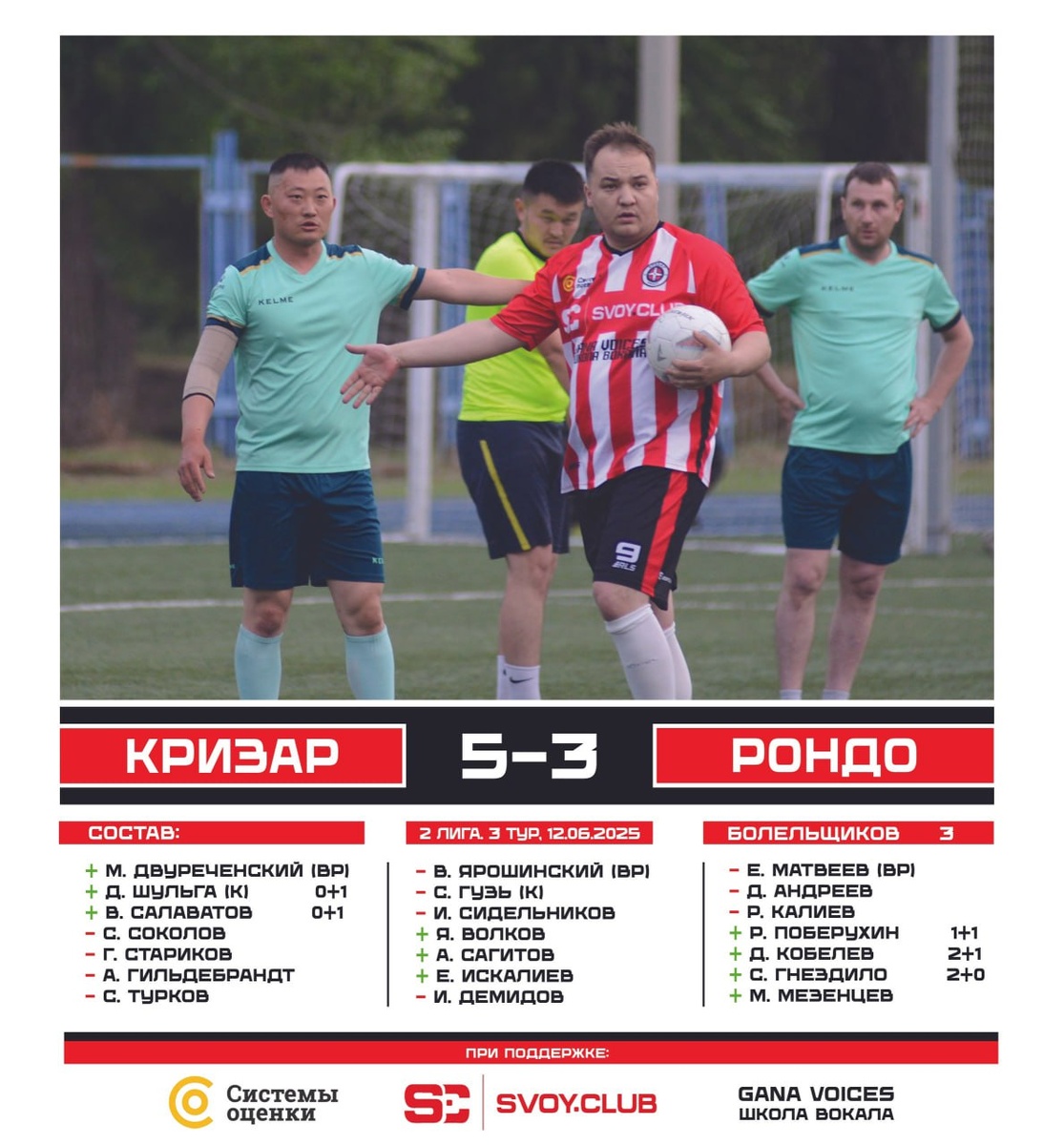 🏆 Оренбургская "Премьер-Лига", 8Х8, 2 лига, 3 тур 🆚 #КризарРондо 5 - 3 📅 12.06.2025 🕑 20:45 🏟 стадион Нефтяник, ул. Заводская Хороший первый тайм ! Плохой второй тайм ! Рондо во второй половине игры показал нам, что нельзя, даже при счете 4 - 0, терять концентрацию ! При счете 4 - 3 стало совсем тревожно, Рондо диктовал условия игры, нам же оставалось отбиваться и рассчитывать на контры, одна из которых увенчалась успехом и зафиксировала окончательный счет. Руководство "крестоносцев" осталось не очень довольно содержанием данного матча ! Думается, что верные выводы будут сделаны уже в следующей игре ! Ведите здоровый образ жизни! Играйте в футбол⚽️! Болейте за КРИЗАР ❤️🖤! При поддержке: SVOY.CLUB GANA VOICES - школа вокала Системы оценки Оренбургский драматический театр им. М. Горького Оренбургская областная библиотека им. Крупской Уютный гипс #fckrizar #мывоинывсейземли #дапребудетснамисила #WeAreKrizar #SvoyClub
