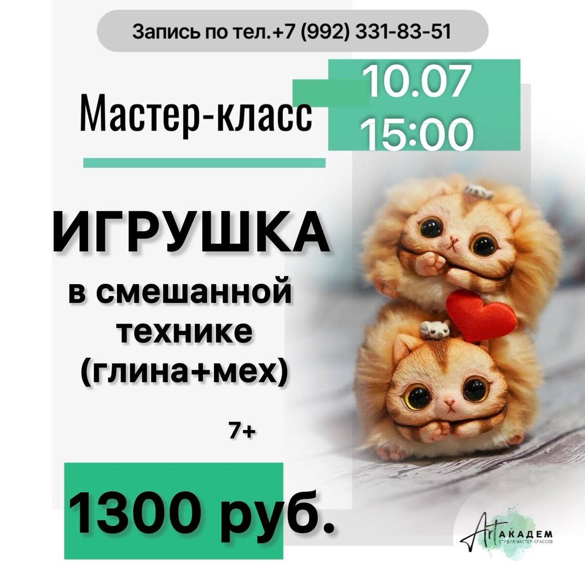 Создай свою собственную игрушку в смешанной технике! Мастер-класс по работе с полимерной глиной и мехом. 👩🏻🎨Научитесь сочетать пластичность полимерной глины и мягкость меха, создавая неповторимые образы. В ходе мастер-класса вы: ✔️Освоите основные техники работы с полимерной глиной: лепка, формовка, запекание. ✔️Научитесь правильно обрабатывать мех и сочетать его с глиной. ✔️Создадите свою собственную уникальную игрушку, которую сможете забрать с собой! 👩🏻🎨Не нужно иметь никакого опыта – всё покажем и расскажем! Мы обеспечим Вас всеми необходимыми материалами и инструментами. Что Вас ждёт: ✔️Пошаговое руководство опытного мастера. ✔️Уютная творческая атмосфера. ✔️Возможность проявить свою фантазию и креативность. ✔️Готовая уникальная игрушка, созданная вашими руками! Есть свободные места! 🔗 +7 (992) 331-83-51 @ArtAkadem66 📅 10 июля 15:00 ⏰ Продолжительность: 2-2,5ч 🪙 1300 руб. Присоединяйтесь к нам и откройте для себя мир смешанных техник! #мастеркласс #полимернаяг