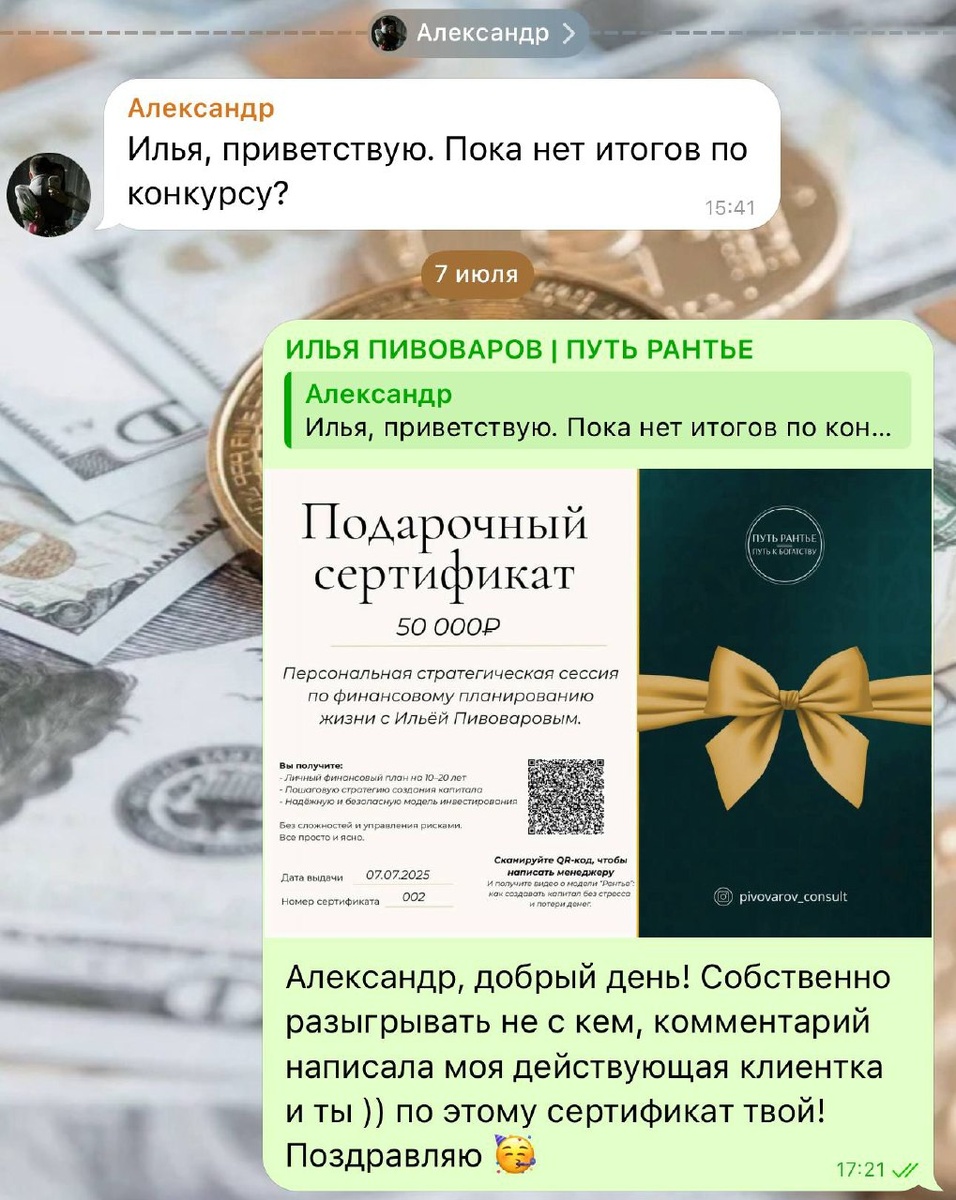В ответ на пост 🎉 Александр, еще раз поздравляю тебя лично и публично!🤝 Ты стал победителем розыгрыша после эфира с Марией и получил подарочный сертификат на 50 000₽! ⠀ 📜 Это не просто бумажка, а приглашение на стратегическую сессию, где: — мы разберём твою финансовую ситуацию, — найдём слабые места и точки роста, — составим чёткий РентаПлан, как прийти к капиталу и создать пассивный доход. ⠀ 🔥 Ты сделал простое действие — комментарий — и получил ценный ресурс. Это напоминание нам всем: Пока одни думают, другие делают. ⠀ 📩 Чтобы использовать сертификат — просто напиши менеджеру по QR, и мы всё организуем. И не забывайте: Следите за эфирами, участвуйте, комментируйте. Иногда один шаг может стоить вам +50 000 к жизни 😉 #ПутьРантье #ИльяПивоваров #финансы #конкурс #победитель