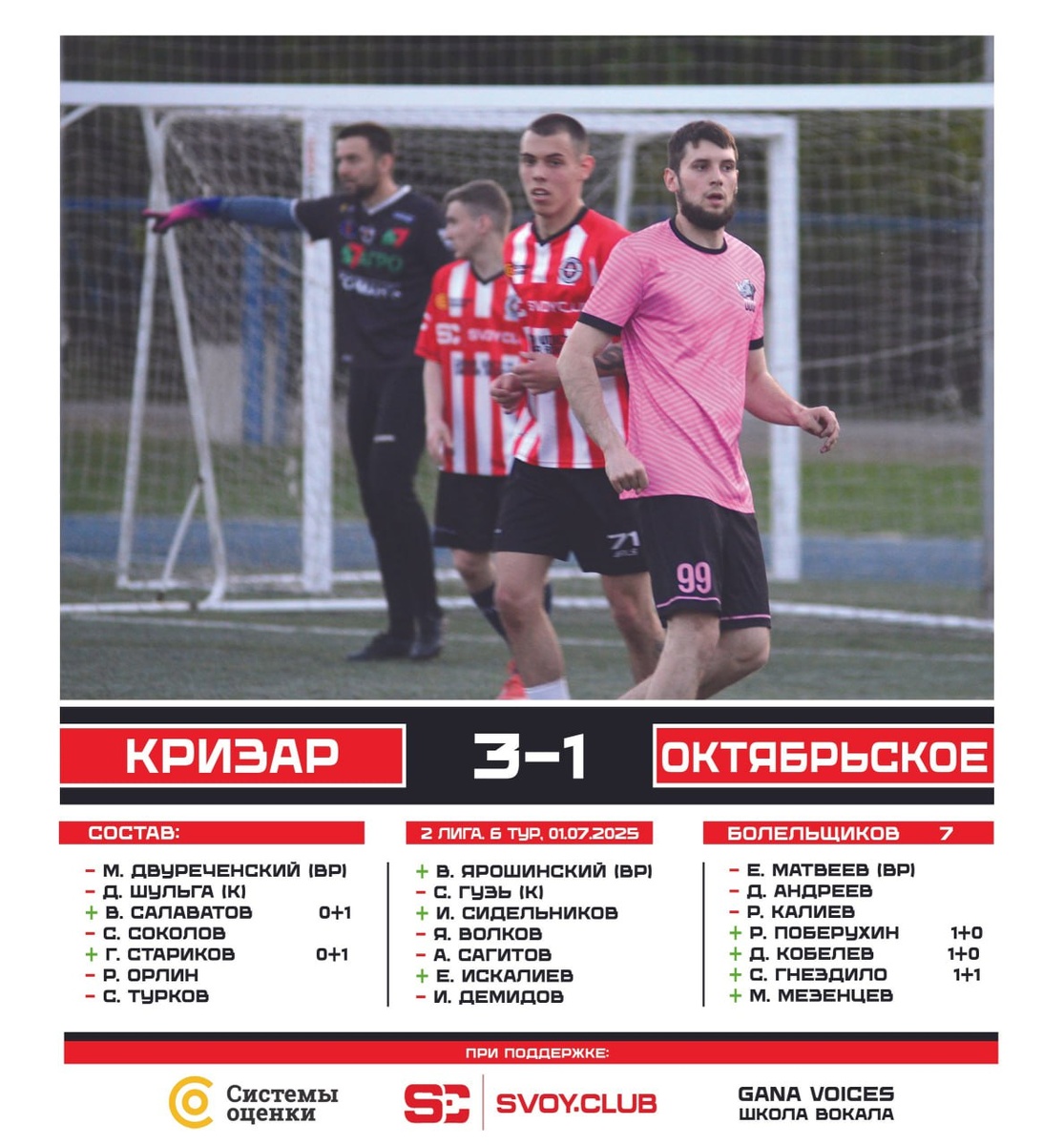 🏆 Оренбургская "Премьер-Лига", 8Х8, 2 лига, 6 тур 🆚 #КризарОктябрьское 3 - 1 📅 01.07.2025 🕑 20:00 🏟 стадион Нефтяник, ул. Заводская Второй летний месяц начали с победы ! Победы важной ! Победы сложной ! От этого - такой ценной ! Все "крестоносцы" сыграли в свой футбол, максимально эффективно ! Благодаря чему и удалось сломить сильного соперника ! Идем ! Дальше ! Ведите здоровый образ жизни! Играйте в футбол⚽️! Болейте за КРИЗАР ❤️🖤! При поддержке: SVOY.CLUB GANA VOICES - школа вокала Системы оценки Оренбургский драматический театр им. М. Горького Оренбургская областная библиотека им. Крупской Уютный гипс #fckrizar #мывоинывсейземли #дапребудетснамисила #WeAreKrizar #SvoyClub