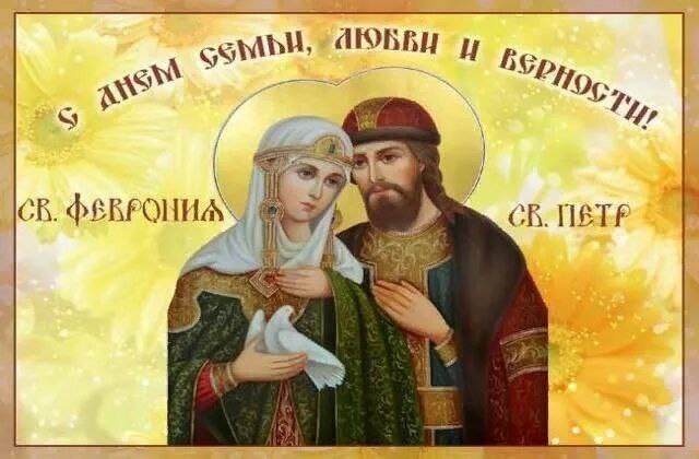 Дорогие братья и сестры. Всех поздравляю с днём семьи. Да именно так. День семьи, любви и верности — это тот день когда нам надо вспомнить о своих родных, а главное о своих любимых! Цените семью и людей, которые любят вас! А главное пребывайте в гармонии уповая на Божью помощь. Святые благоверные Петр и Феврония молите Бога о нас!