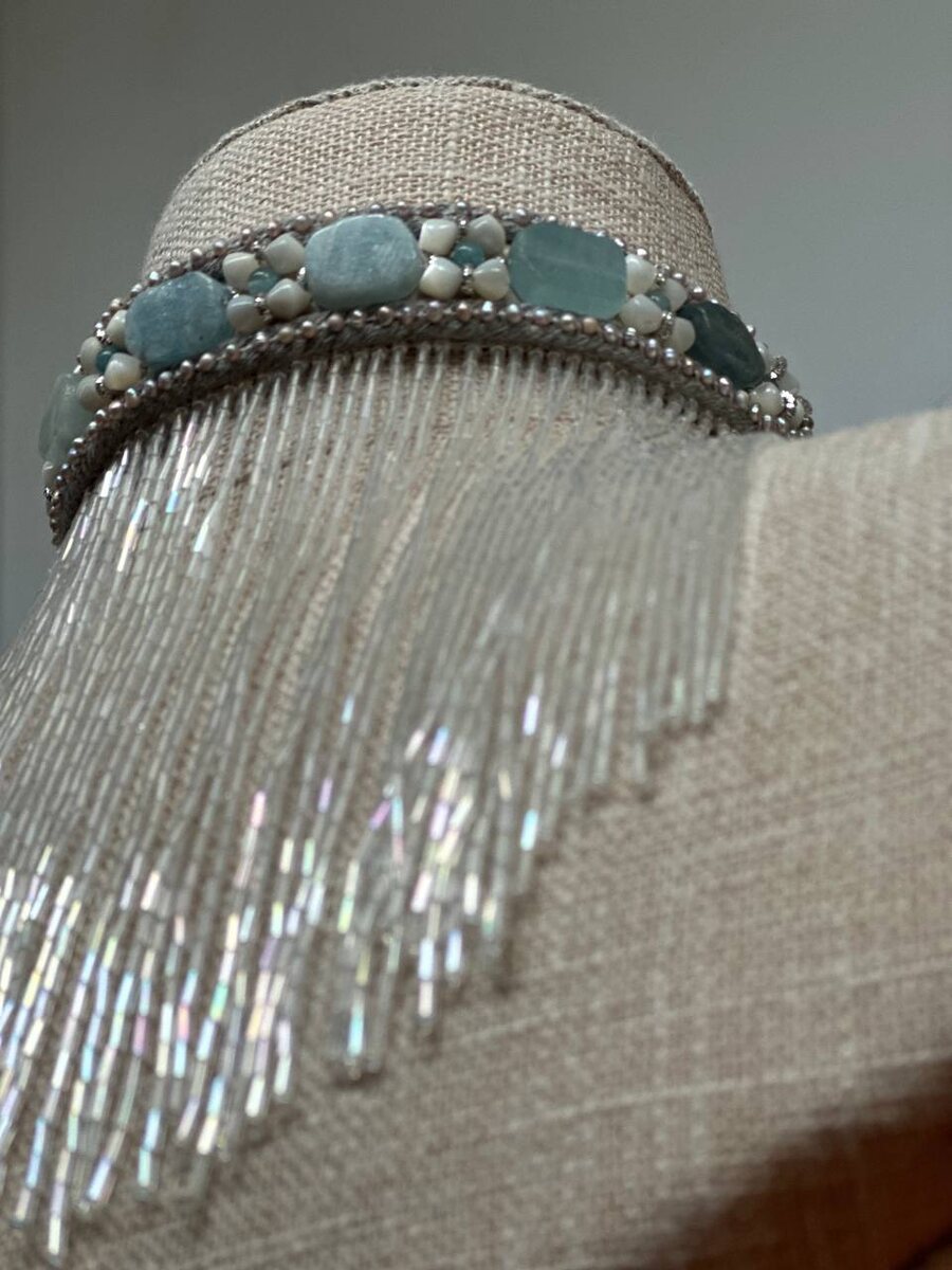 (Не)чокер Шила его с желанием передать спокойствие и внутреннее равновесие, когда гуляешь по песку, а рядом шумит прибой. Легкий летний бриз, белая пена волн и нежность предрассветного моря. Это украшение сплело воедино: -серый пресноводный жемчуг, - перламутр, - ларимар, - аквамарин, - кварц, конечно же не(чокер) сшит на шелке - идеальное решение для нежной кожи шеи, с роскошной переливающийся бахромой 15 см. ПРОДАНО Такой же купить уже не получится, но могу сотворить для вас на заказ ваш особенный! Пишите в сообщения группы, либо лично мне: @alinachistyakovaemb