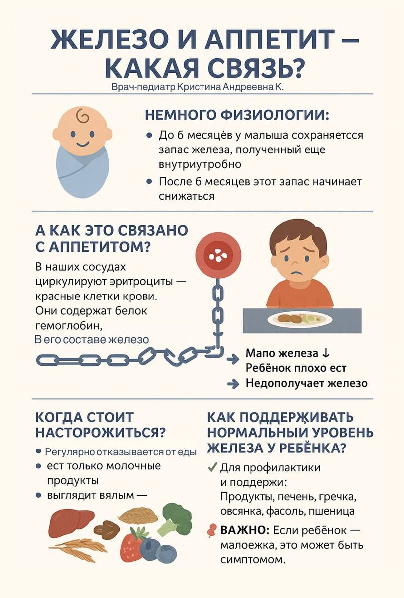 Железо и аппетит — какая связь ? 🤩🤩🤩🤩🤩🤩🤩🤩🤩 🔖Немного физиологии: До 6 месяцев у малыша сохраняется запас железа, полученный ещё внутриутробно. ⭐️После 6 месяцев этот запас начинает снижаться — поэтому в этом возрасте и начинают вводить прикорм! ❗️В ряде случаев уровень железа падает значительно, что может привести к железодефицитной анемии. ❓А как это связано с аппетитом? ⏺️В наших сосудах циркулируют эритроциты — красные клетки крови. Они содержат белок гемоглобин, а в его составе — железо. ❗ Когда железа мало → снижается уровень гемоглобина → развивается анемия. Один из частых симптомов анемии — плохой аппетит или его отсутствие. 🔃Это замкнутый круг: ▶️Мало железа ▶️Ребёнок плохо ест ▶️Недополучает железо → 🔃 ⬇️Когда стоит насторожиться? ➡️Если ваш малыш: 🌟регулярно отказывается от еды, 🌟ест только молочные продукты, 🌟выглядит вялым — ➡️стоит проверить уровень гемоглобина и ферритина (запасы железа) в крови. 🟣Как поддерживать нормальный уровень железа у ребёнка? ✅Ес