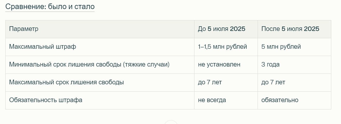 Штрафы выросли в 5 раз С 5 июля заговорить не к месту может стоить семье целого состояния. Штрафы за разглашение налоговой, коммерческой и банковской тайны выросли с 1 миллиона до 5 миллионов рублей. Плюс обязательная тюрьма минимум на 3 года. Раньше можно было отделаться штрафом, теперь деньги придется платить вместе с лишением свободы. Государство решило жестко защищать экономическую информацию от утечек. ‼️Под новый закон попадают не только топ-менеджеры, но и рядовые сотрудники с доступом к конфиденциальной информации. Бухгалтер, разгласивший данные о доходах компании, может лишиться 5 миллионов рублей и сесть на 7 лет. Особенно рискуют сотрудники банков, налоговых органов, IT-компаний. Даже случайная передача служебной информации родственникам или друзьям может обернуться семейной катастрофой. Максимальное наказание применяется, если преступление совершено группой лиц, из корыстных побуждений или повлекло тяжкие последствия. ❌Семейные риски в цифровую эпоху ▫️Современные семь