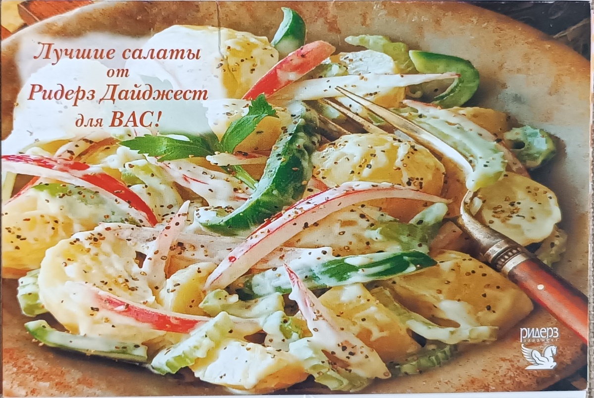 Неизбитые, оригинальные и очень сочные рецепты в наборе открыток от Ридерз Дайджест. В наборе всего 10 карточек-открыток. Но повторюсь, рецепты замечательные, есть время приготовления и калории. И вот такое напутствие от редакции о пользе трав, овощей. Салат из риса с брокколи и салями с интересной заправкой, достаточно калорийный кстати. Цикорий с редиской. Нужно сказать, что листовой цикорий не самый популярный у нас овощ, вкус у него слегка горьковатый. Поэтому пекинская капуста на замену не вариант, но иногда встречается горьковатый айсберг. Хотя, согласитесь, идея салата в целом отличная! Салат из авокадо с креветками. Заправка тоже необычная, ну и водяной кресс, он сейчас продается. Не нашли замените шпинатом или руколой. Кальмары, обжаренные на гриле с салатом ромен и помидорами. Кальмары маринуются в вине и масле, и уверена это очень вкусно. Для тех кто любит более сытные блюда, шампиньоны фаршированные салатом с птицей. Из интересного - ягоды малины в украшении. Дубовый сал
