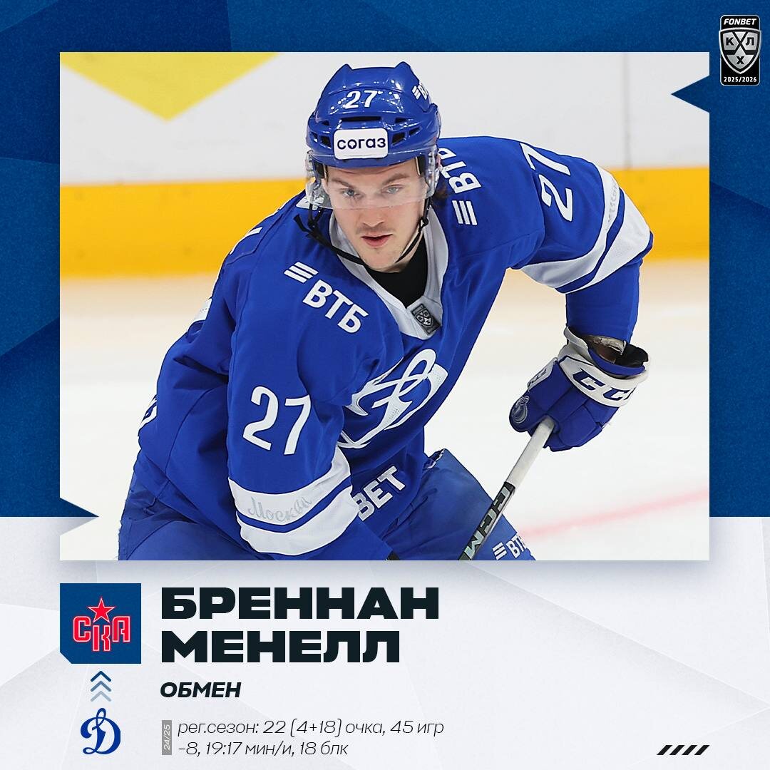 ⭐️ Третий бомбардир-защитник московского «Динамо» Бреннан Менелл отправляется в СКА. Взамен динамовцы получили защитника Тимура Кола и вратаря Станислава Бережного.