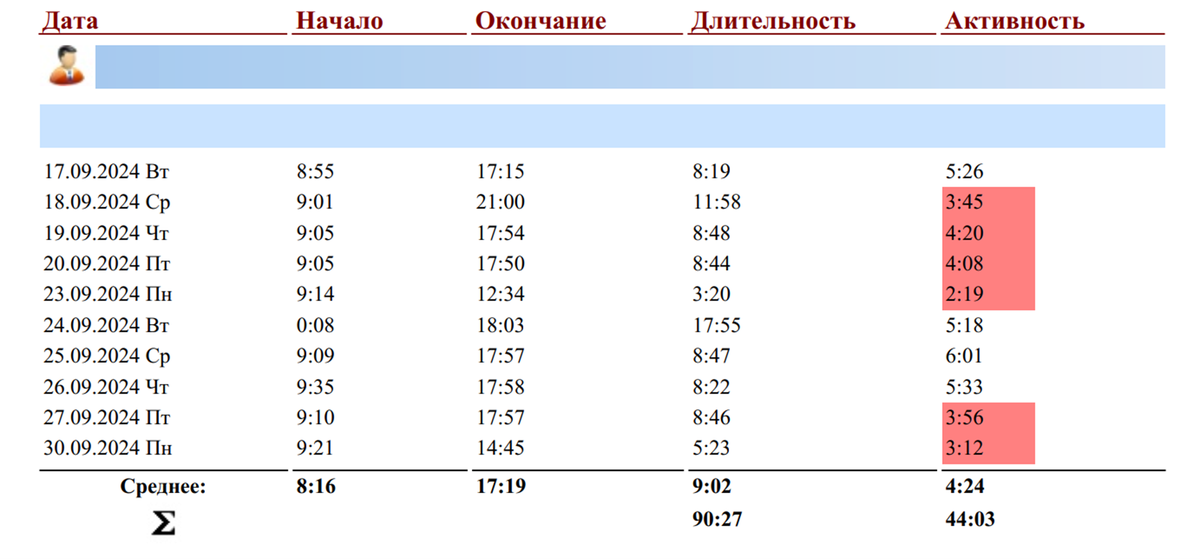 Если посмотреть на график активности, то можно увидеть, что сотрудник вовремя приходит и уходит с работы, при этом продуктивно работает только шесть часов из восьми.