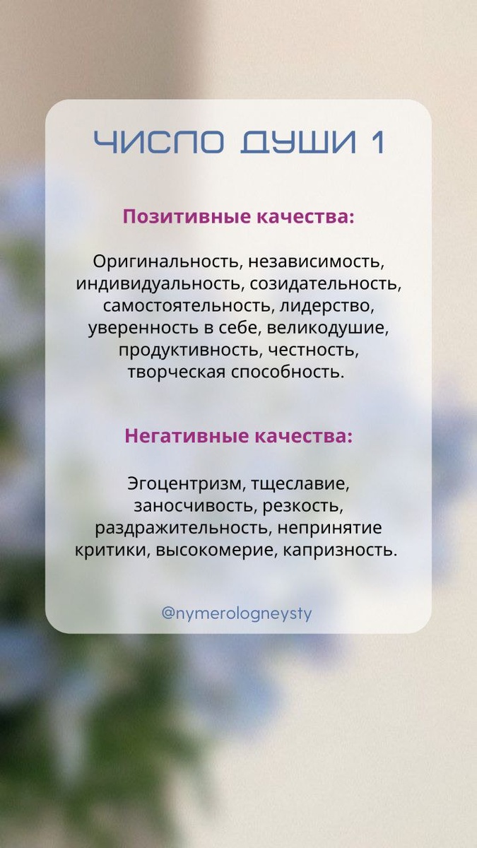 Обладатели Числа Души 1 – прирожденные лидеры и новаторы! Ваша сущность заряжена энергией первопроходца. 🔮 Позитивные качества Числа Души 1 (Ваша Сила!): Эти сильные стороны – фундамент вашей личности! Если какие-то позитивные качества пока раскрыты не полностью – это нормально! Ваша планета-покровитель поможет вам смело развивать их дальше. Работайте над собой – потенциал Единицы огромен! ⚠️ Негативные качества (Зоны Роста для Числа 1): Важно понимать: Эти тенденции – не приговор, а "теневая сторона" вашей мощной энергии Числа 1. Чрезмерная уверенность может перерасти в высокомерие, а самостоятельность – в полное игнорирование других. Над этими качествами Единицам особенно важно работать осознанно. Ваше Число Души 1 – это дар первопроходца! Приняв свои сильные стороны и осознав зоны роста, вы сможете направлять свою энергию лидерства и новаторства максимально эффективно и гармонично, используя поддержку своей планеты. 🔥 Обладатели Числа Души 1, узнали себя? Какие из ваших силь