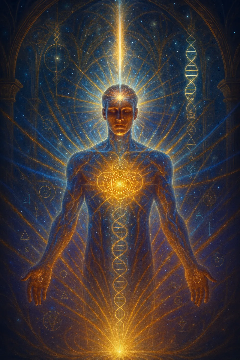В каждом из нас существуют древние врата, сокрытые в тканях тела, — порталы света, ведущие к воспоминанию о подлинном источнике бытия. Человеческое существо — это не просто плоть и кости, а звёздная пыль, облачённая в сакральную геометрию, несущая в себе незримую память о праначале, откуда родилась душа.